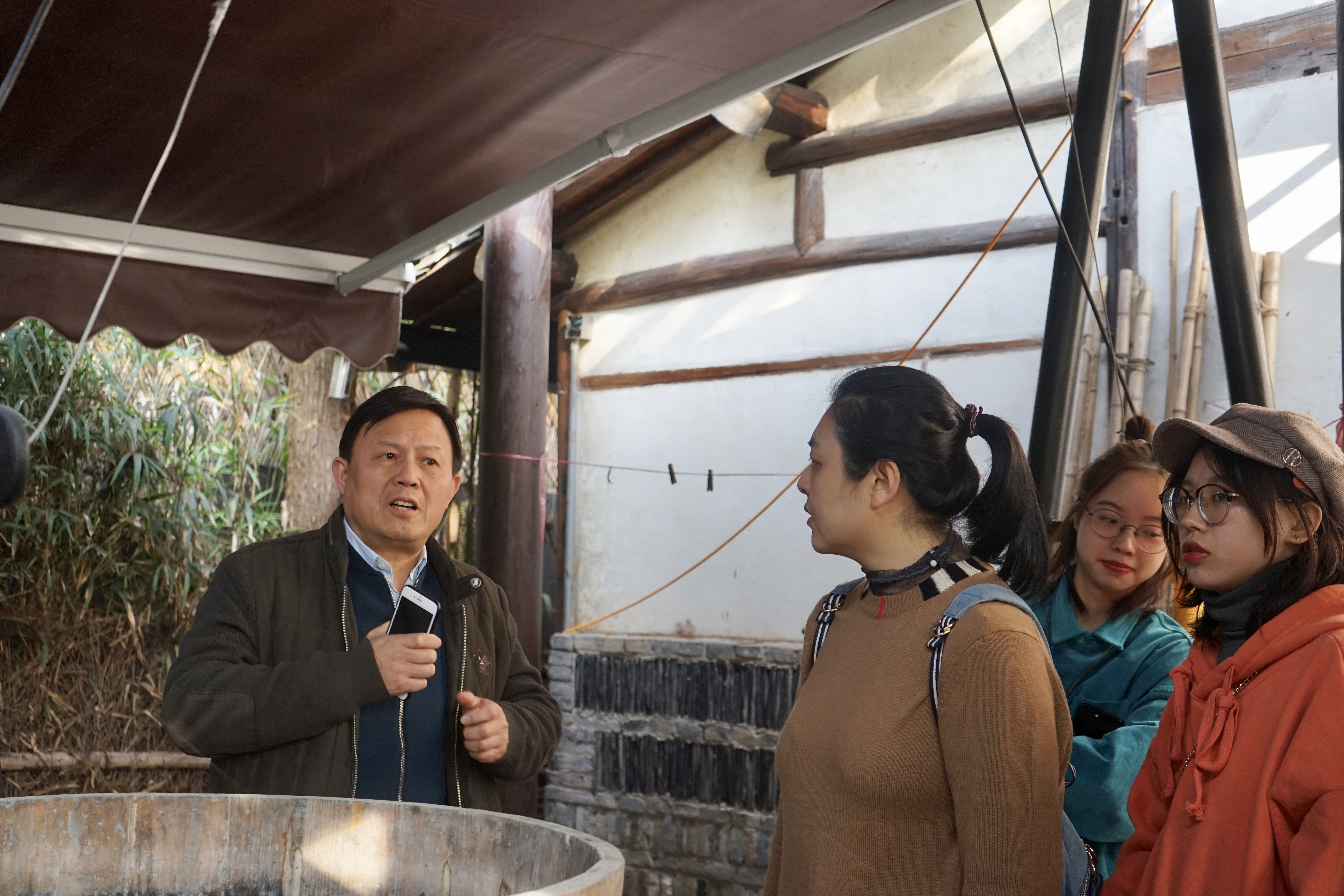 汪老师先带领大家来到桑蚕及染织演示区,同学们看到了植物印染工具和场景演示,在一片桑树林前,了解到了蚕丝植物染织技术的发展,仿佛触摸到中华桑蚕和染织技术的辉煌。接着汪老师带领大家来到修复工作室,同学们见识到了几百乃至上千年前的古代经幡等古代丝织品,在修复师的演示过程中。同学们了解到一些先人高超的纺织技术,对古代丝织品的精美感到由衷赞叹,更对修复师高超的修复技术感到由衷敬佩, 这是一门需要人沉静下来的修复艺术。