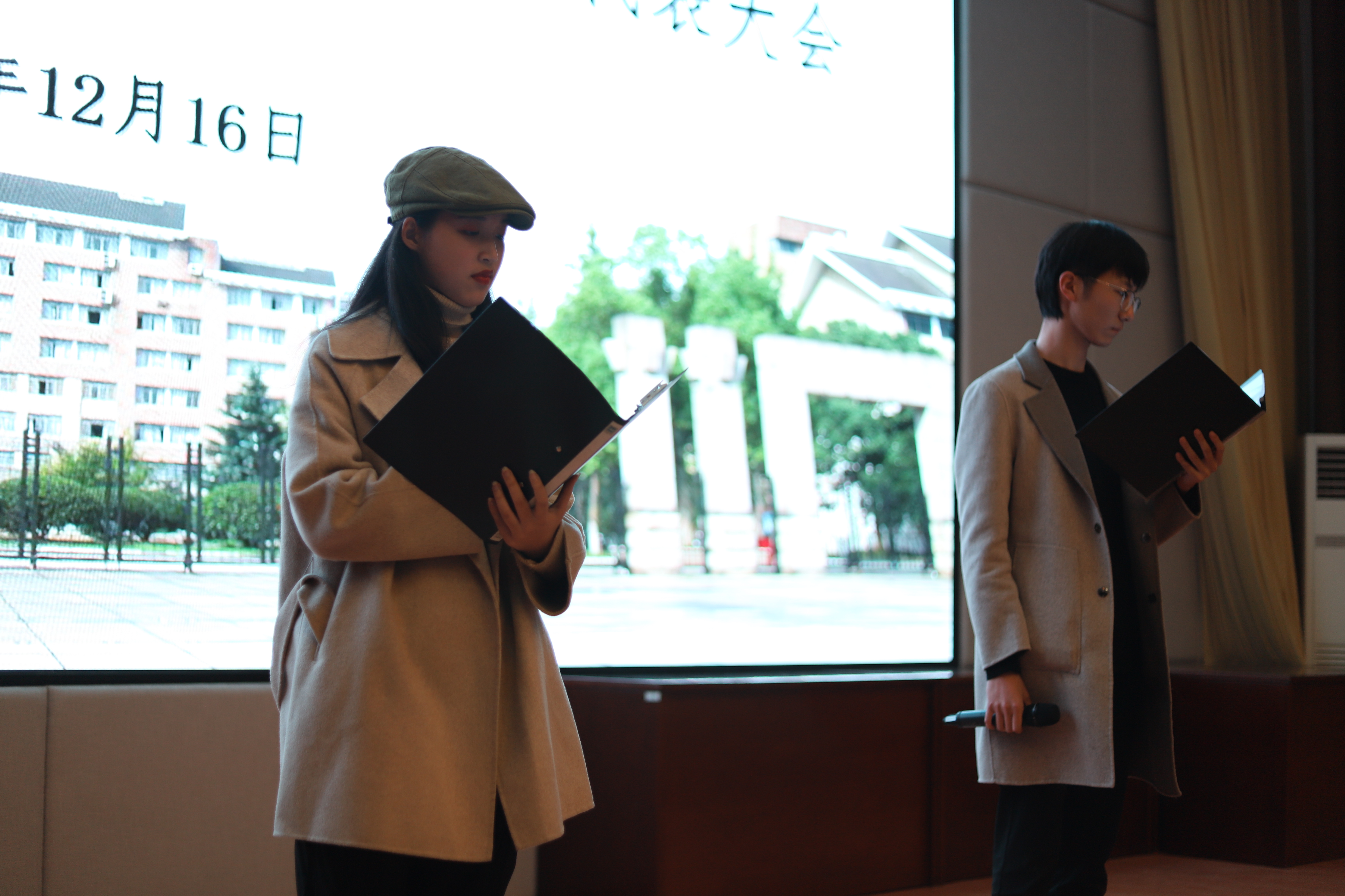 文化管理系第十六届团总支副书记洪晴、第十六届学生会主席戴倪豪分别作了浙江艺术职业学院文化管理系第十六届团总支、学生会工作报告。他们回顾了十六届团学的主要工作内容,总结现状与不足。