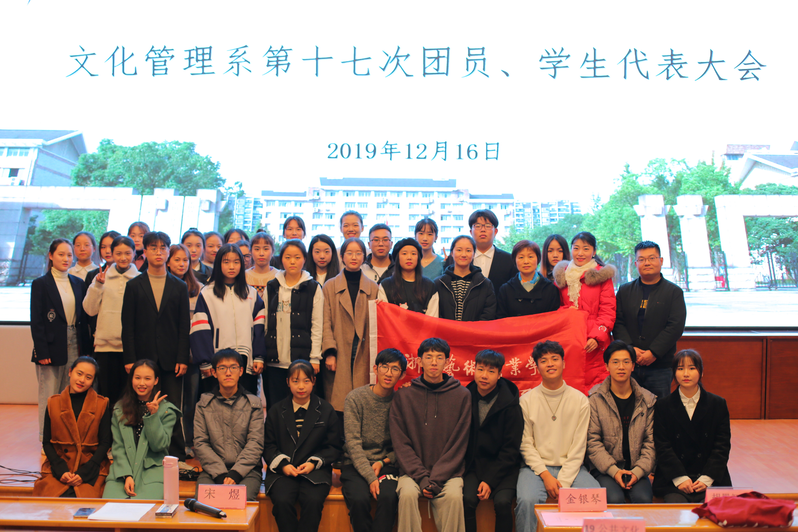 最后,金银琴宣读了大会选举产生的25位文化管理系第十七届团学委员会委员名单。随着铿锵激昂的团歌声,大会顺利闭幕。文化管理系第十六届、十七届团学合影留念。