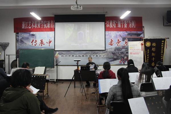 2019年,是学院在萧山区楼塔镇设立“非物质文化遗产教学实践基地”的第四年,也是与楼塔镇人民政府签订《关于国家级非物质文化遗产——楼塔“细十番”保护传承弘扬协议三年计划》的推进年。为积极践行“志愿服务+项目共建”的校地合作,根据地方文化特色与实际需求,文化管理系主任谢青赴楼塔开讲公开课《民族乐器演奏技法——以楼塔“细十番”为例》。他以楼塔“细十番”一套三曲为例向传承人们讲述了乐器演奏的基本技巧、十番音乐的形象和规律特点等,通俗易懂、幽默风趣。传承人们边听边记,收获满满,意犹未尽。系青年教学实践志愿服务团教师宋煜也积极投身于楼塔细十番琵琶乐器教学中,利用周末时间赴楼塔镇开展细十番的分声部教学,她结合初学者常常遇到的学习误区与乐曲演奏的韵律训练,认真耐心的讲解示范,深受学员好评。