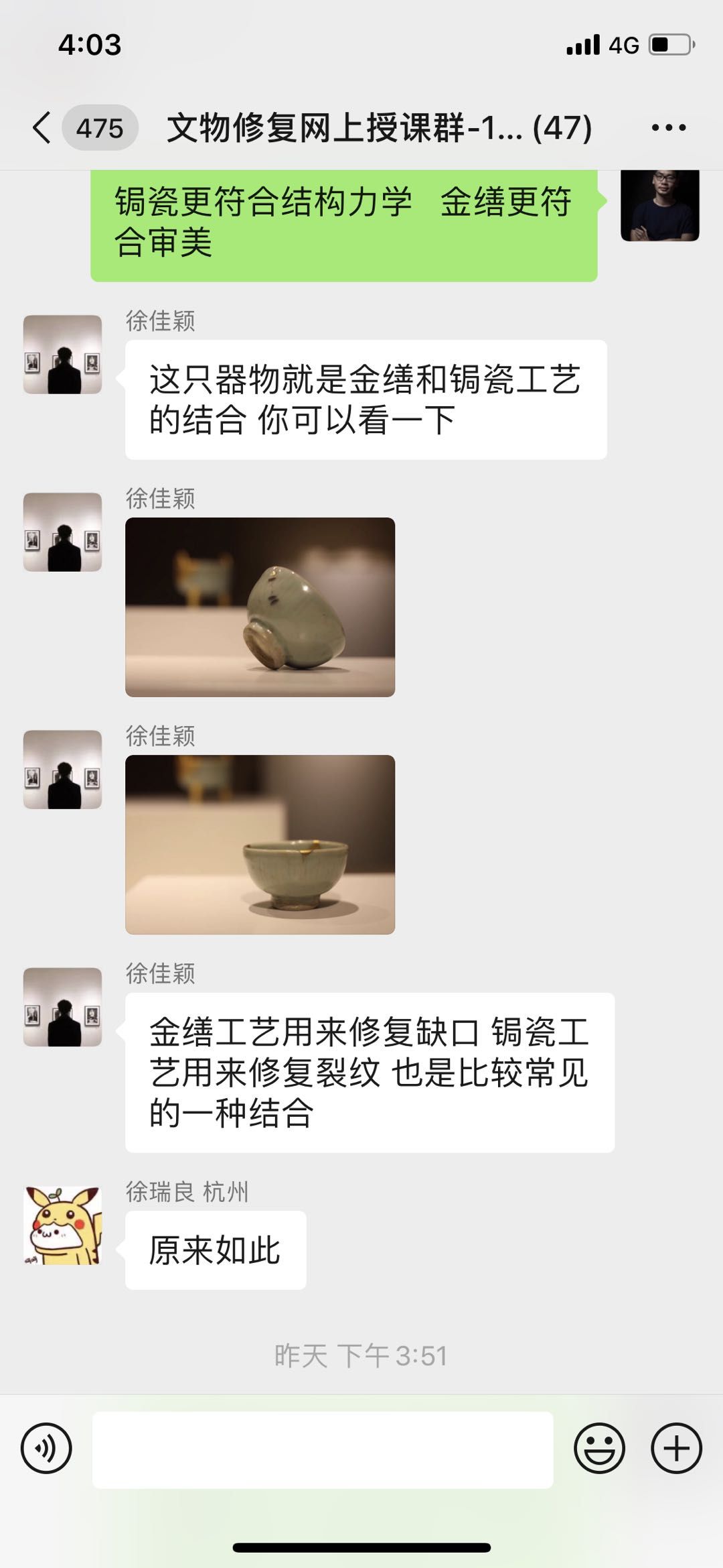 文物修复与保护专业核心课程有文物鉴定、文物修复、古籍修复、书画修复、陶艺基础与修补等。教研室教师们通过微信平台、抖音直播等方式开展丰富多样的实践课程。如文物修复课程第一课通过抛出问题、解决问题的形式开展,抛出问题古陶瓷修复中文物修复的形式与其他修复形式的不同点和意义,让同学们查看资料,了解什么是文物,陶瓷修复的种类及特点等,了解文物的定义、修复的工艺及原则,更好地为后期的修复对象制定可行性方案,实施合理的修复手段。