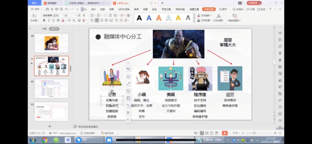 文化创意与策划专业核心课程有新媒体营销策划实务、创意学基础、文化产业概论、创意文案写作实务、新媒体策划短视频制作等。为了让学生更清楚地了解学习内容,突出学习重点,掌握学习内容,教研室老师们使用了钉钉平台在线直播、微信讲解和PPT演示等教学方式,开展线上互动教学。如短视频制作第一课结合时下疫情为主题布置学生构思制作一个短视频作业,内容为文字加图片,下次课前老师对作业进行抽取点评。