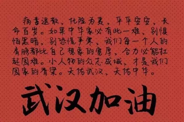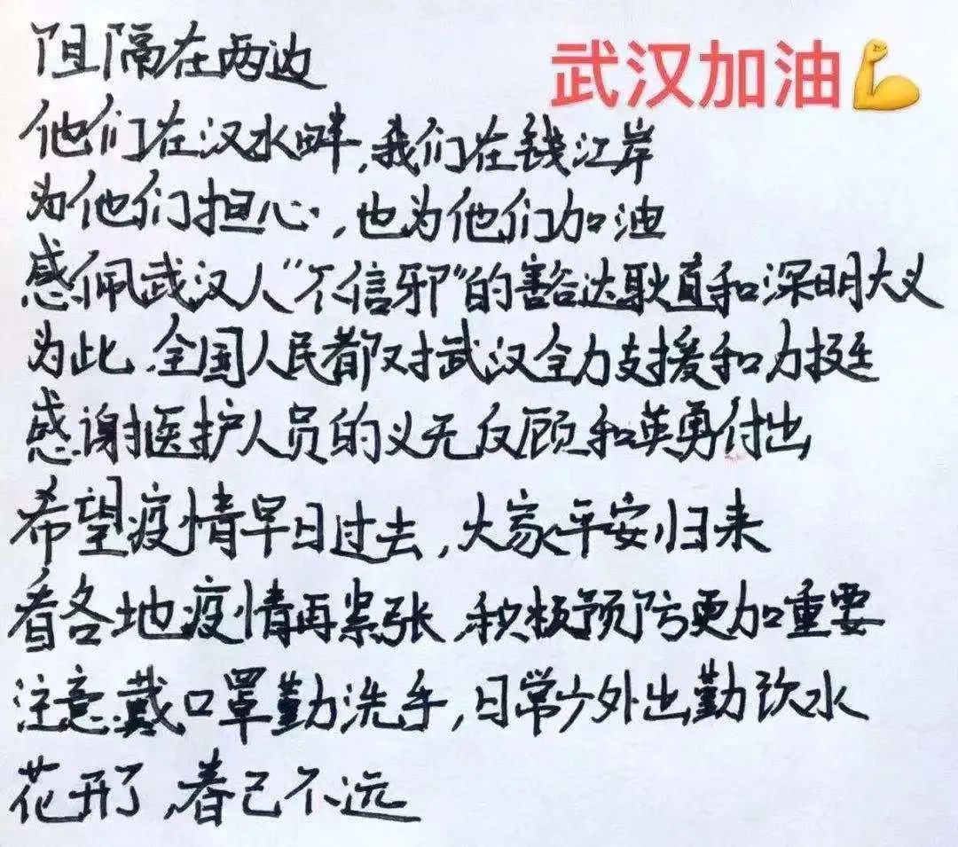 千言万语不能深切表达我对武汉的担忧和对白衣天使们的敬意。脑海里终于明白了什么是“欲作家书意万重”的难过,我相信中国人一定会漂亮打赢这次“战役”。武汉一定要加油啊,武汉一定要挺住啊!你们身后还有亿万中国人民在为你们呐喊。