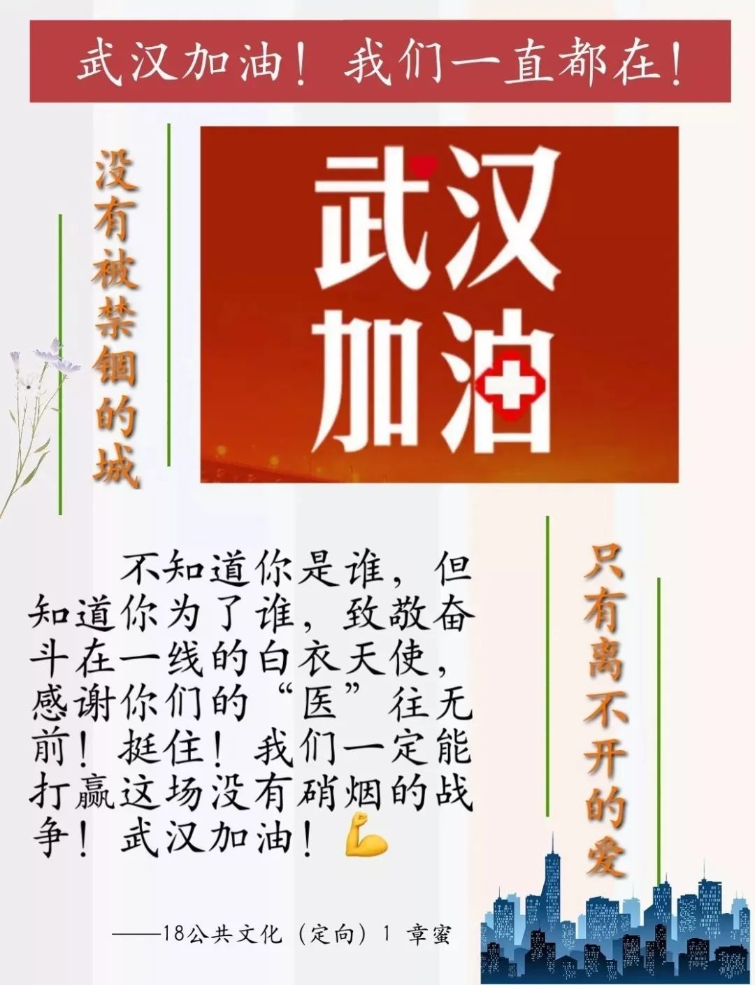 “我们的城市生病了,但是我们会治好他,以后也欢迎你们来”,这是最近关于武汉事件最让我鼻酸的一句话。现在,不仅仅是武汉在努力,全国人民也和武汉一起加油。无数像钟南山先生一样的勇者奔赴武汉,为解决疫情不顾危险,我们要为他们加油,为武汉加油!一切都会好起来的!