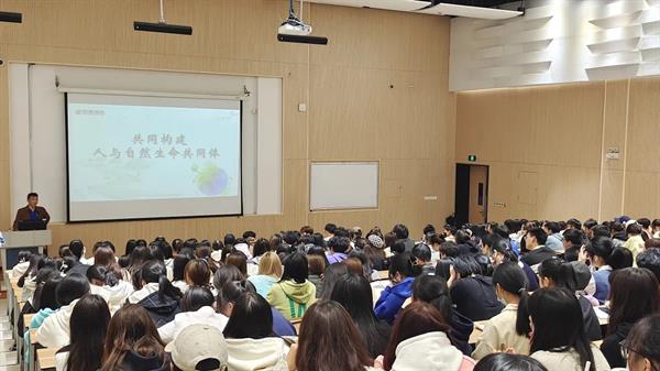 课上,沈军甫围绕“现实之困”、“中国方案”、“中国担当”三方面向同学们展现着了共同构建人类与自然命运共同体的重要性。他通过对自然因素与社会因素的结合举例,阐述了现实之困给人类带来的危害,以”一荣俱荣,一损俱损”的立场更深层的表示出当下环境问题的严峻性以及国际社会团结合作的意义。沈军甫分析了习近平总书记的生态文明观,展现生态兴,文明兴;人不负青山,青山必不负人的思想主张。他说道:“生态是统一的自然系统,不能因小失大,急功近利。”让在座学生们受益匪浅。