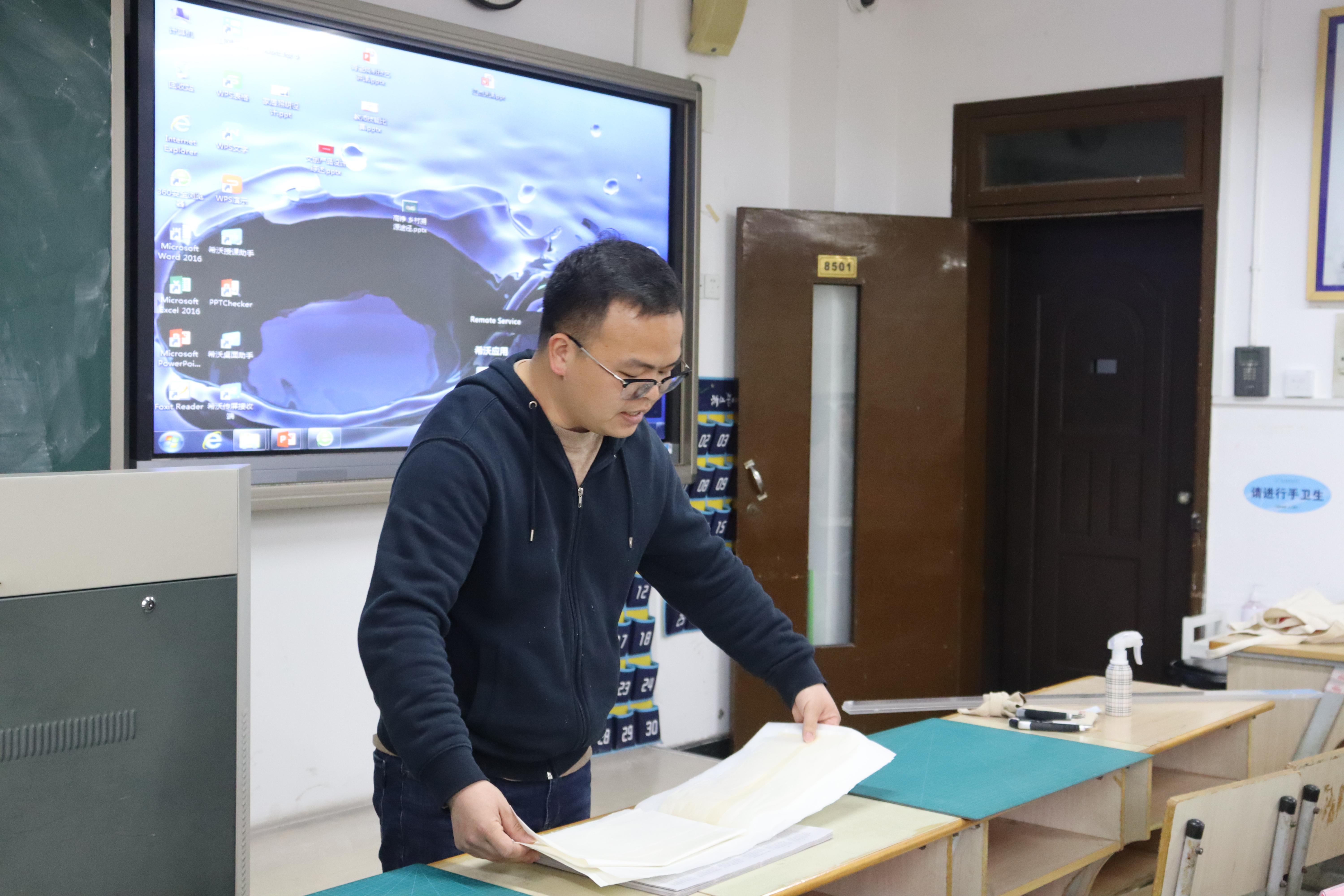 文物修复与保护专业教研室的江杰理论结合实践讲解了《文物修复与书画装裱》,他讲解了装裱与古籍修复的内涵,并现场展示了刀工与裁纸工艺,并邀请两位老师上台教学互动,课堂氛围生动活泼。