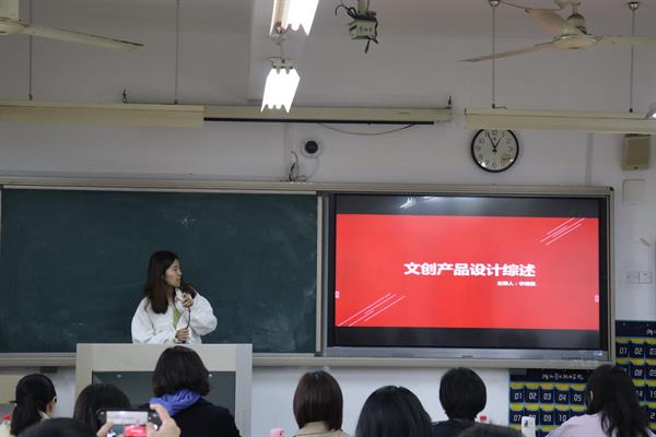 文化创意与策划专业教研室的李旭晨讲课主题是《文创产品设计综述》,她从文创的定义、形态、研究对象、应用、产品设计和案例分析几个方面条理清晰地讲解了“文创=文化+创意+产品”的理念。