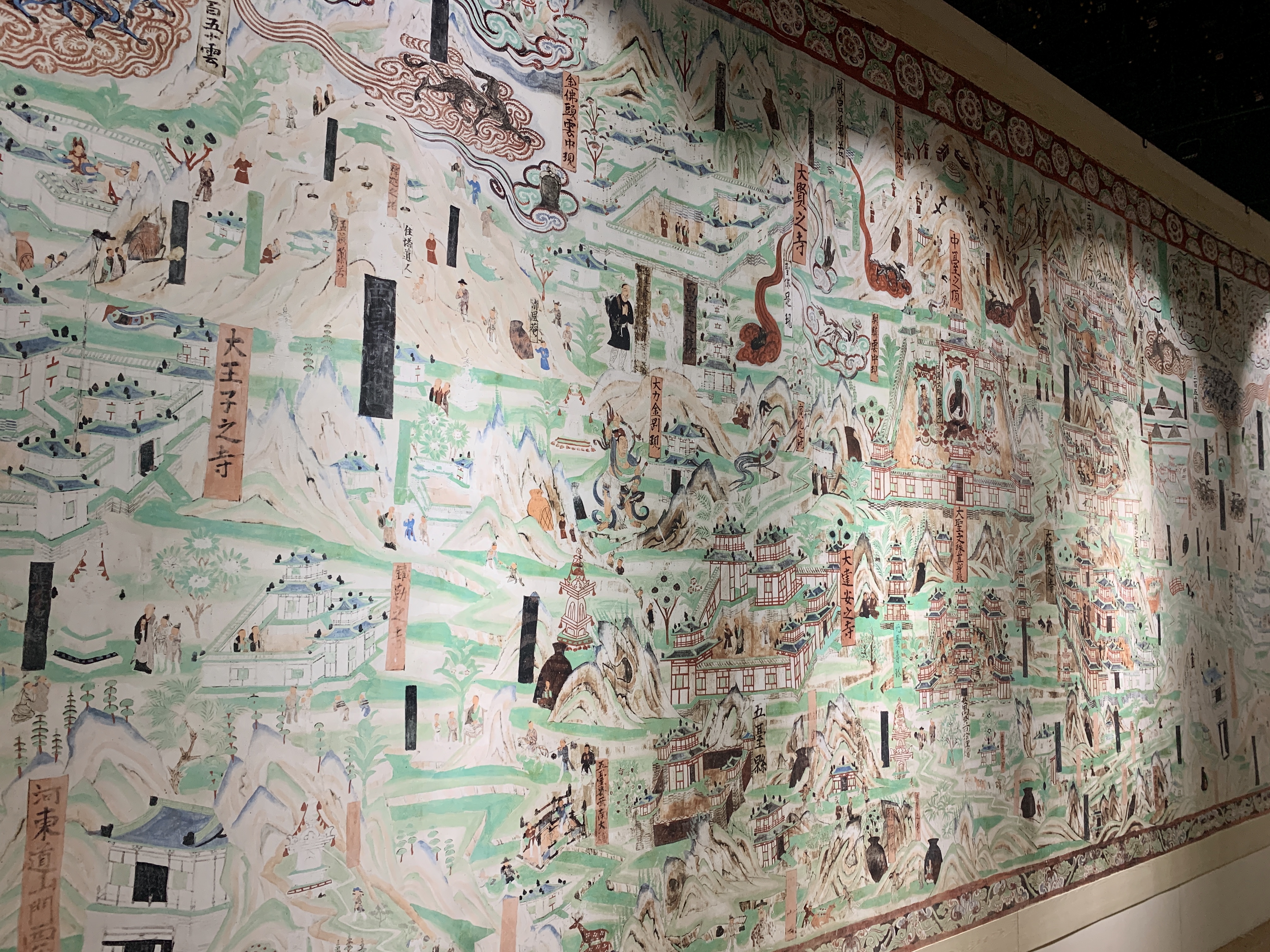 展厅展陈了莫高窟的石窟艺术,分为早期、中期、晚期三个阶段。讲解员带领师生走近敦煌壁画艺术,讲述莫高窟的大事记。敦煌石窟和敦煌藏经洞出土的文物浓缩了中古敦煌的历史,形象地记载了在开放背景下欧亚文明的互动、汉民族与其他民族的交融;反映了4—14世纪一千多年间佛教及艺术的流传及流变;保存了丰富生动的中外艺术形象及艺术的源流传承;展示了中古时期广阔的政治、军事、文化、科技等社会生活的场景,具有超越时空经久不衰的魅力,在不同时代、不同民族、不同信仰、不同地域的人们中间产生共鸣。这也正是中华民族以自己的优秀文化为世界做出的贡献之一。
