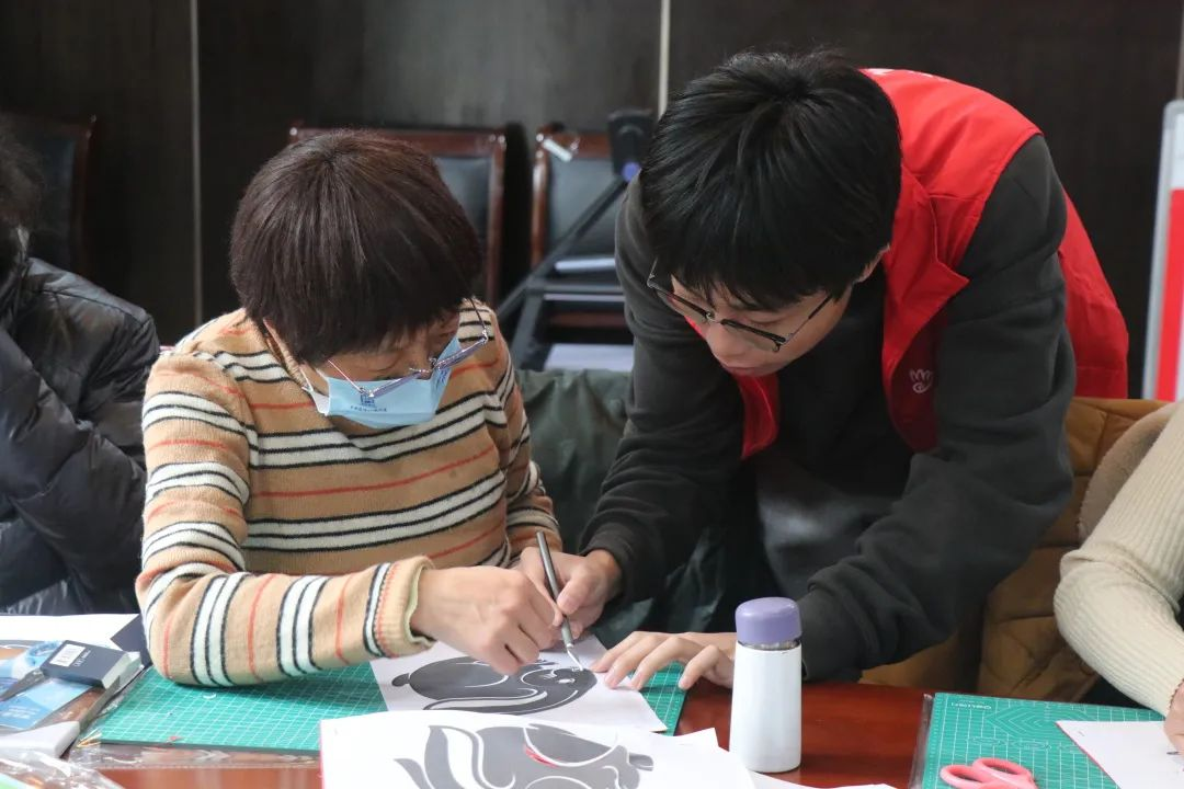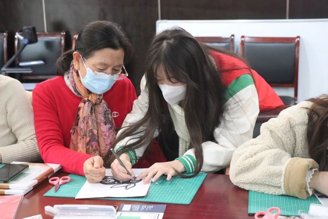 手工艺师生带领手工艺社区学院学员开展非遗剪纸迎新春教学活动。中国剪纸是一种用剪刀或刻刀在纸上剪刻花纹,用于装点生活或配合其他民俗活动的民间艺术,其传承赓续的视觉形象和造型模式蕴含了悠久的中国传统文化历史,寄托人们丰富的情感。
