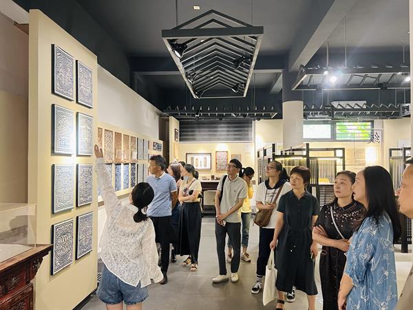 中国工艺美术大师、蓝印花布印染技艺省级代表性传承人、桐乡市丰同裕蓝印布艺有限公司总经理哀警卫带领浙江艺术职业学院教师一行参观公司及内部桐乡市非物质文化遗产馆蓝印花布分馆,体会蓝印花布印染技艺魅力。整个场馆占地22亩,设有蓝印花布展示馆、蓝印花布生产区、非遗传承教室、草木染色研究室、蓝印花布创意设计室、现代蓝印花布产品衍生区等。场馆中陈列了丰同裕历史资料及蓝印花布实物档案,蓝印花布的起源和发展脉络清晰可见,由古及今,眺望未来。