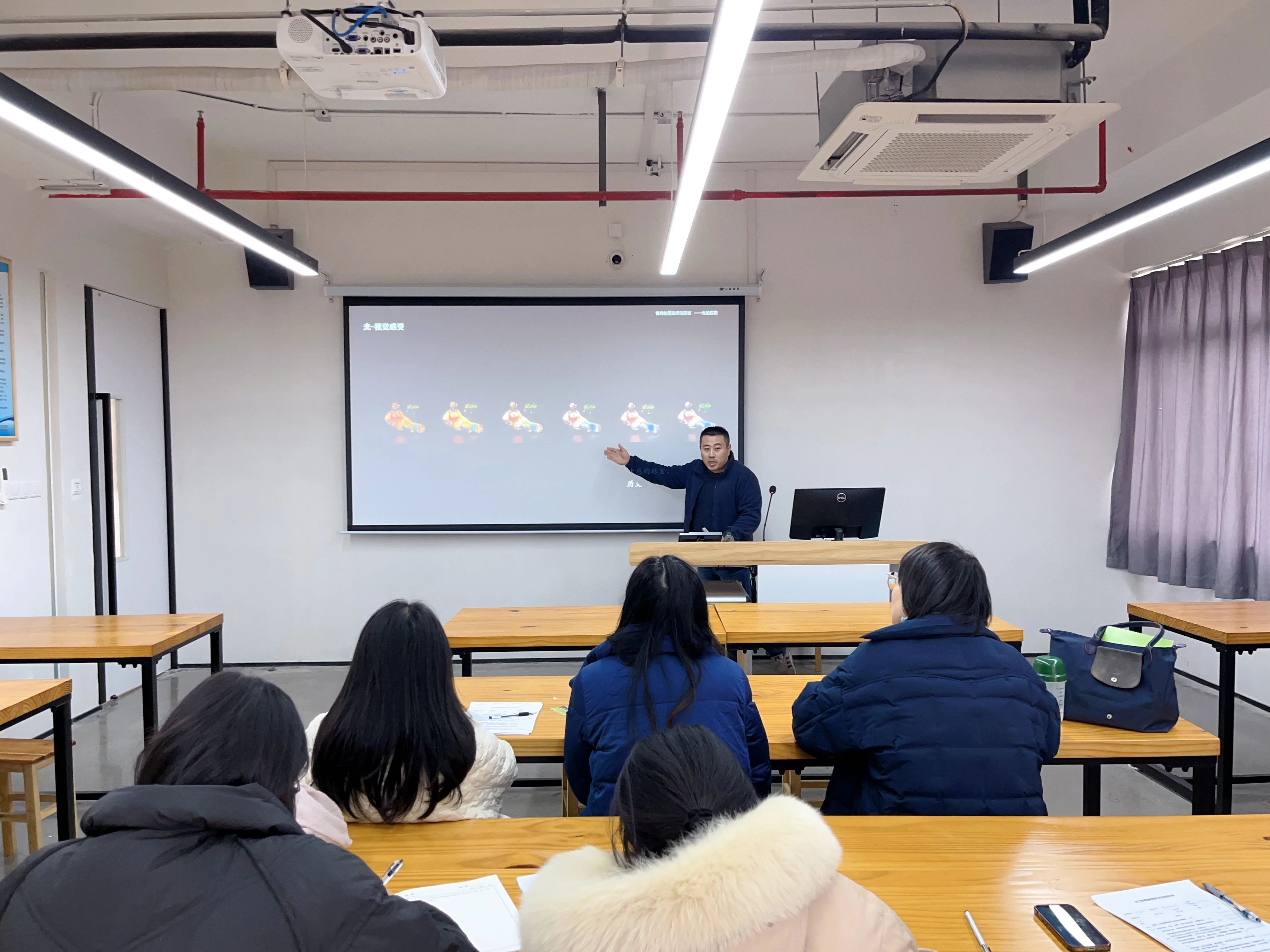 展示艺术设计专业包君伟教师示演了课程《博物馆照明基础-光的应用》通过对日常生活的体验引出光的专业知识与应用属性,将光与博物馆展陈设计建立链接。