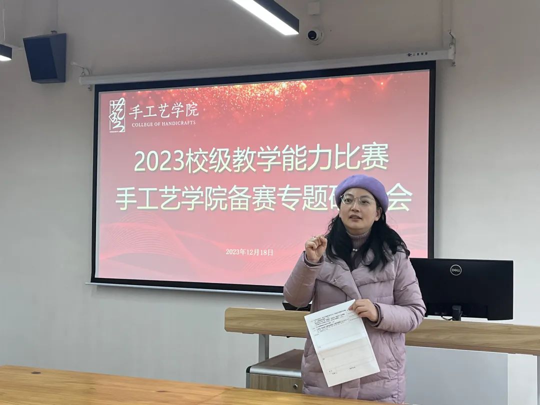 12月18日,手工艺学院针对校赛要求开展备赛专题研讨会,特邀陈萍萍教授进行现场指导和经验分享,帮助手工艺学院参赛教师们打磨课程教学,提升教学技能、完善教学方法、优化教学设计,在比赛中充分发挥自己的特点和优势。