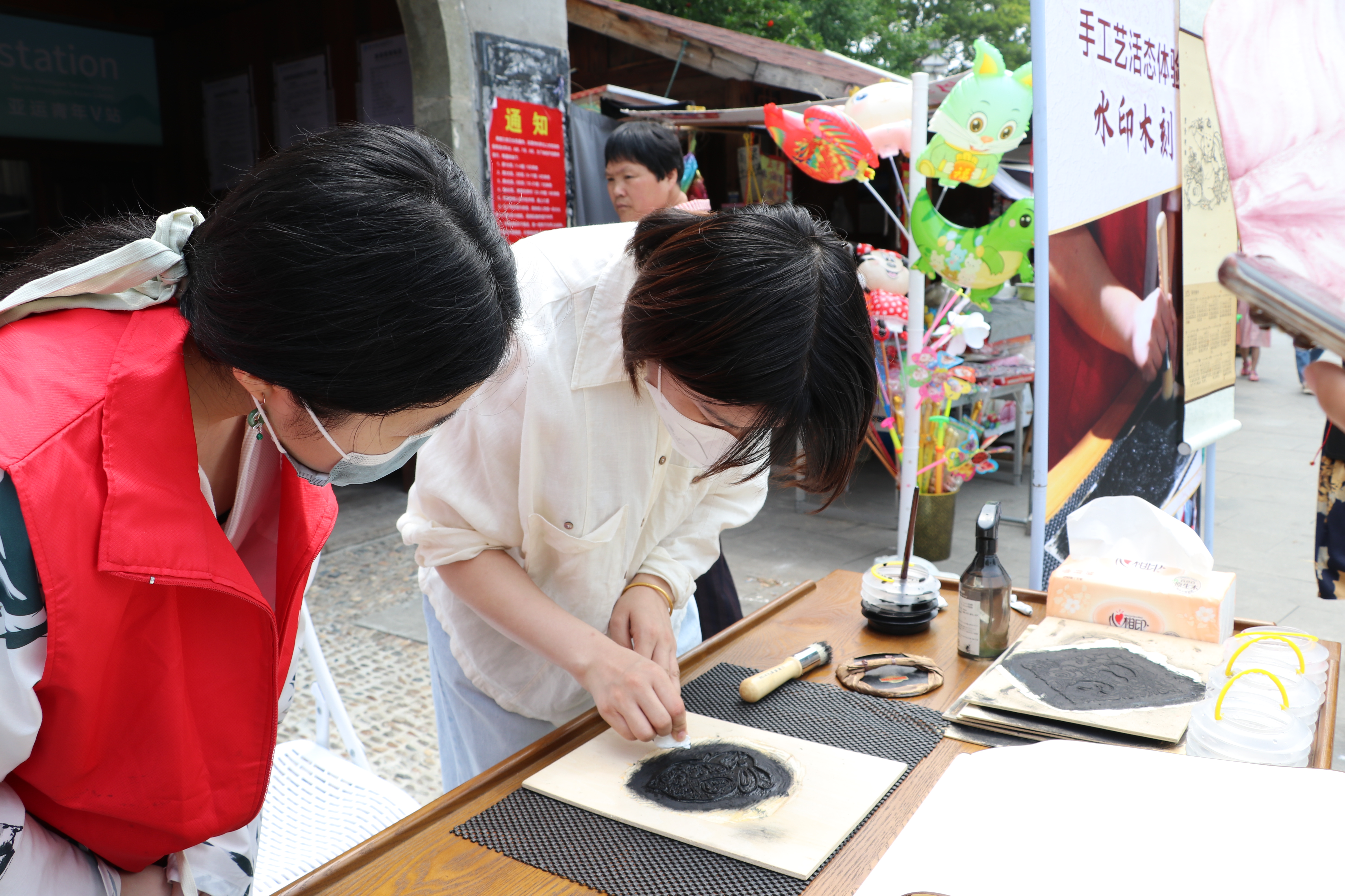 在水印木刻的摊位上,艺小匠同学详细示范了木版水印画的印制步骤,在他们的指导下,体验者们有模有样地将蘸取墨水的刷子在木版上刷色,仔细地均匀涂抹版面,观察好版面的位置后,把宣纸对准印版平铺,借助马莲在平铺的纸上来回旋转摩擦,使纸面和版面上的墨充分接触。