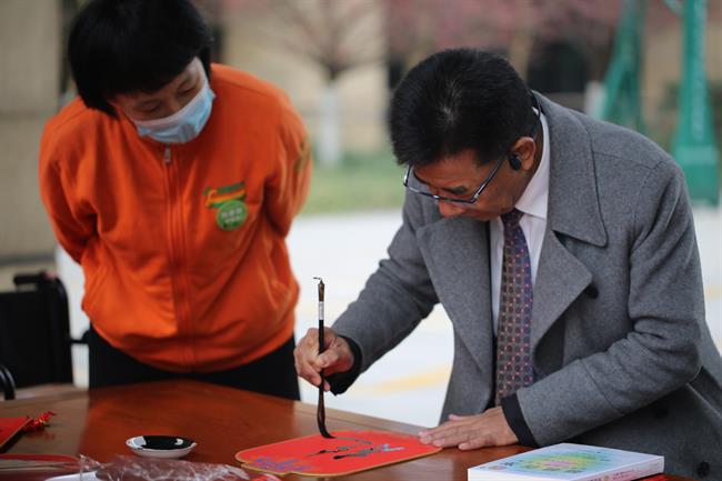 水印木刻体验摊位前,一位长者正认真地印制着自己的作品,每个动作都透露出对传统文化的欣赏和敬意;扎染作品摊位上,一块块布料迎风飘扬,绽放出独特的风采;瓷器作品摊位内,精美的杯、盏、碗引得老人们驻足欣赏;手写福字摊位前,人潮涌动、福字飘香,一笔一划都带着新年的祝福和希望。