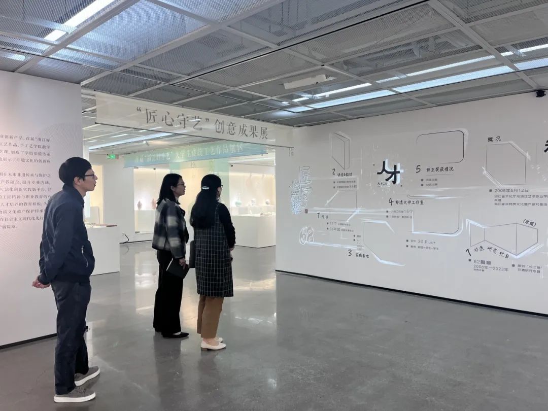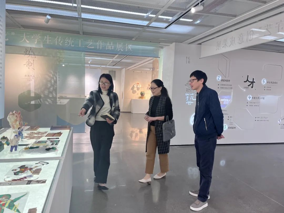 手工艺学院党总支书记钟黎介绍了学院课程体系、学生优秀作品以及人才培养方案等内容,学院领导班子陪同参观“匠心守艺”非遗创意成果展,希望与浙江旅游职业学院旅行服务与管理学院加强院际交流和合作,共同探索学院发展和人才培养新路径。