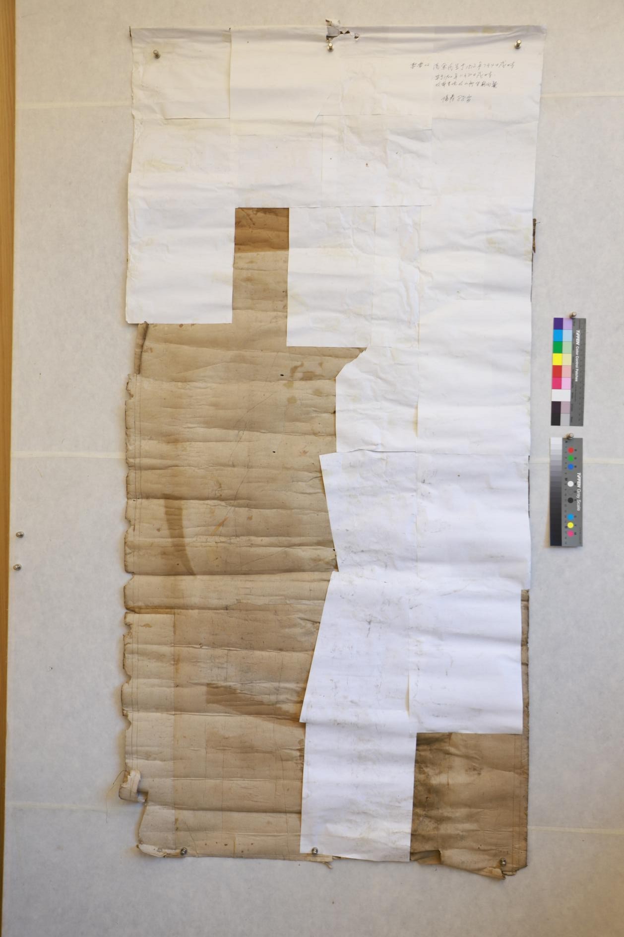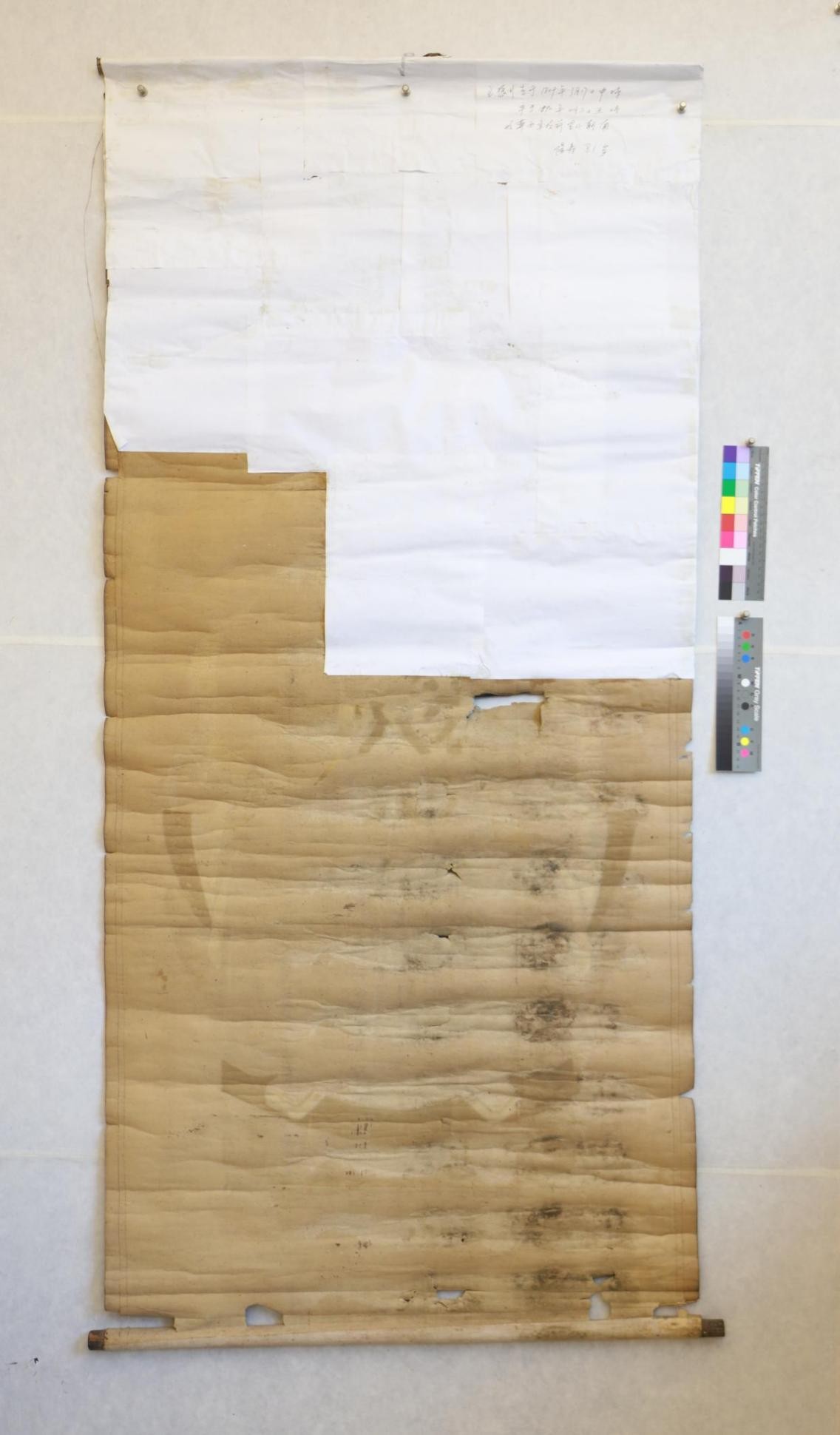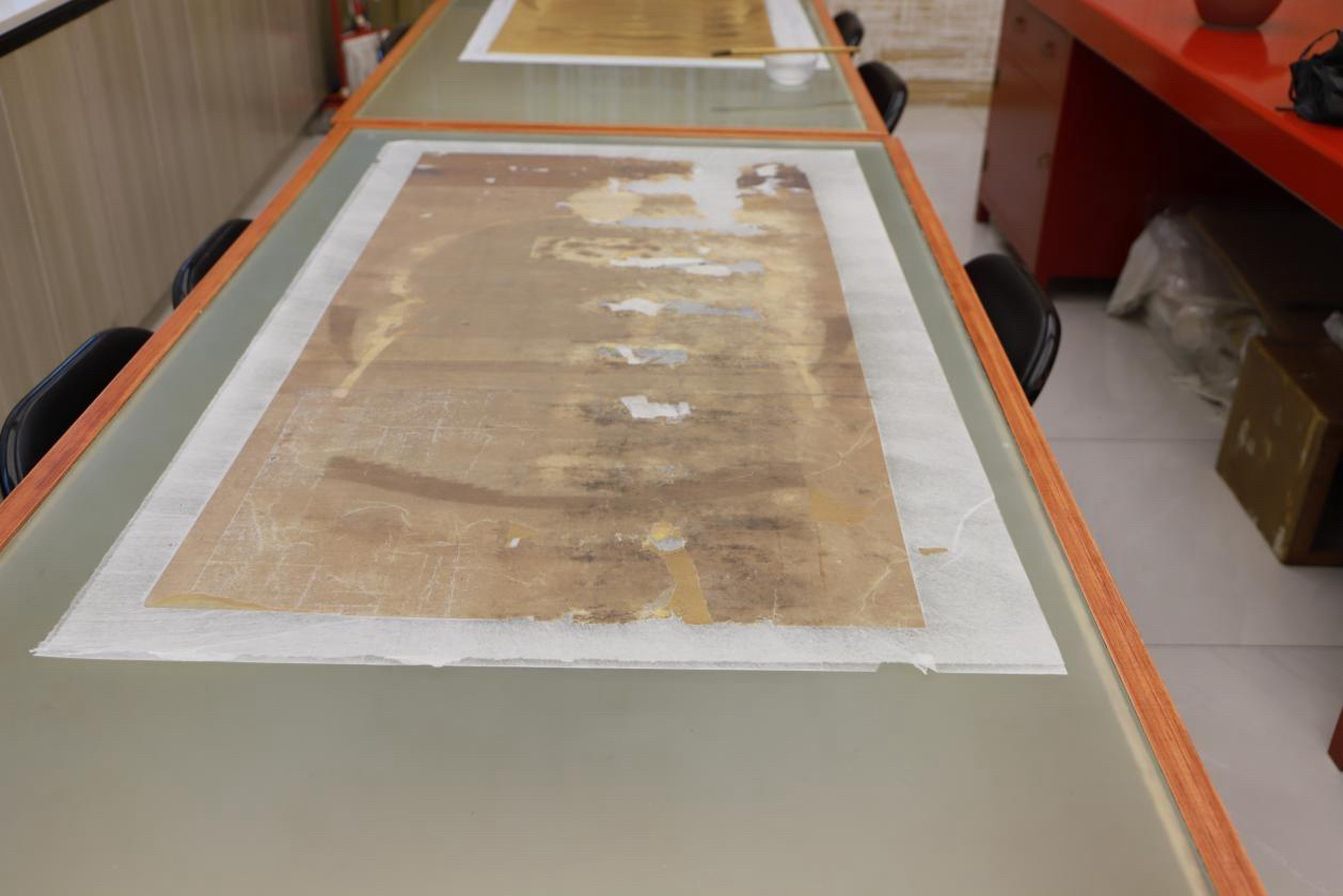 第三,因画幅缺失面积大,糟朽严重,所以在保证胶矾水打到位后需要根据画芯原有颜色将缺失部分填上,根据不同位置颜色进行不断调整,最终达到与画心一致。