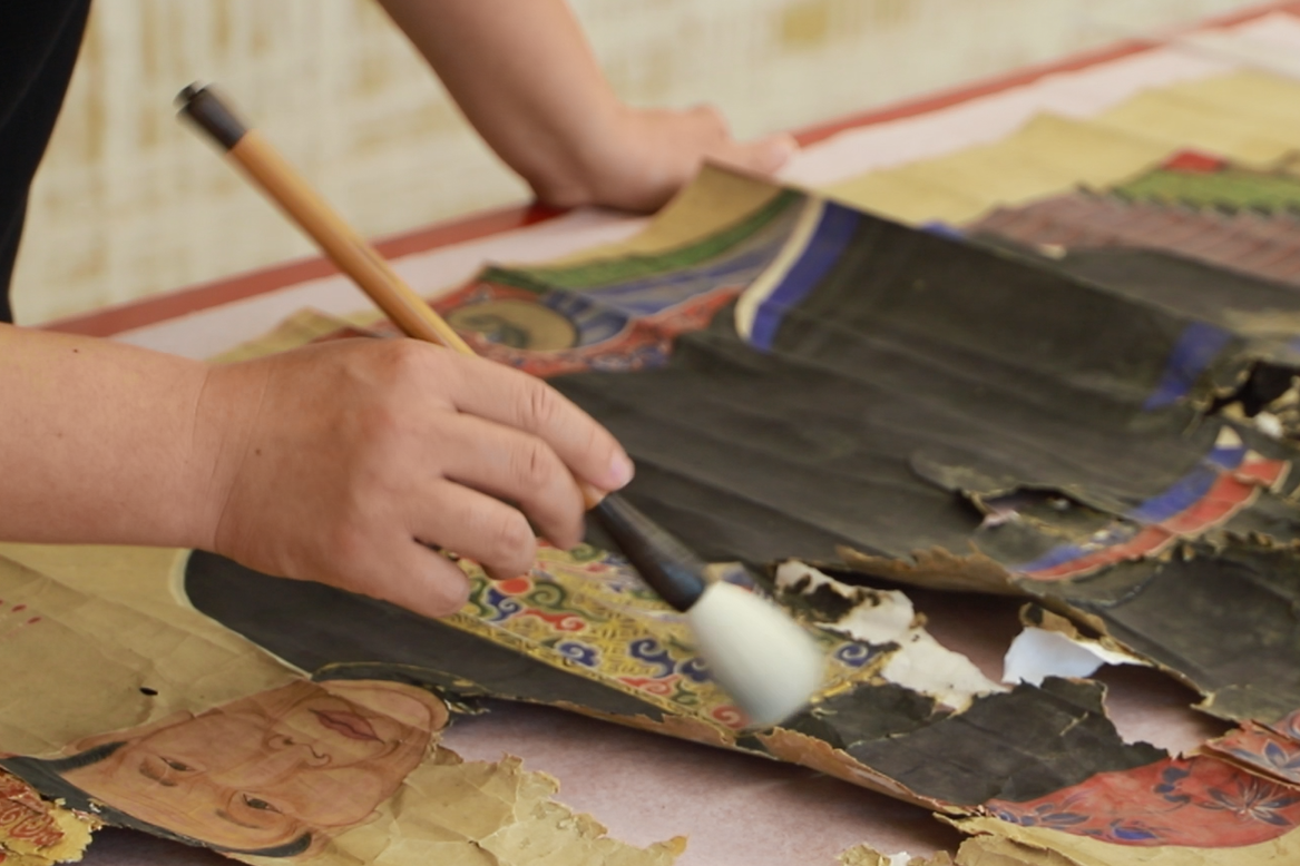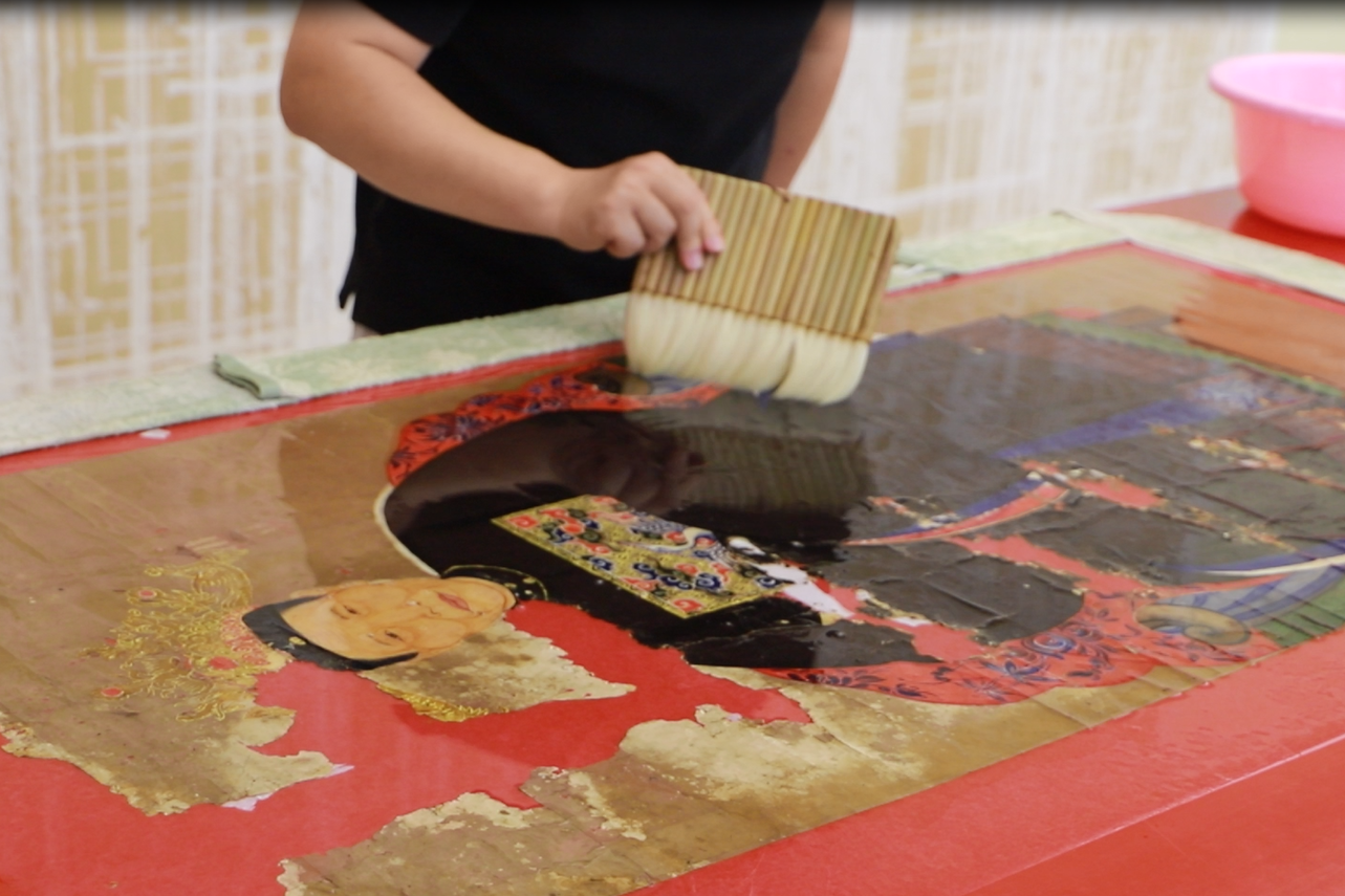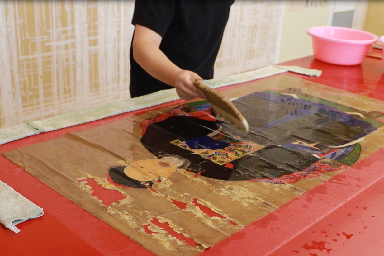 第二,清洗过程因为画心霉烂、糟朽、掉色等原因,纸质极为脆弱,故先要对脆弱部分进行加固、固色等操作,用开水进行淋洗,去除画芯上的霉斑、污渍,清洗过程需要极其细心,动作要轻。