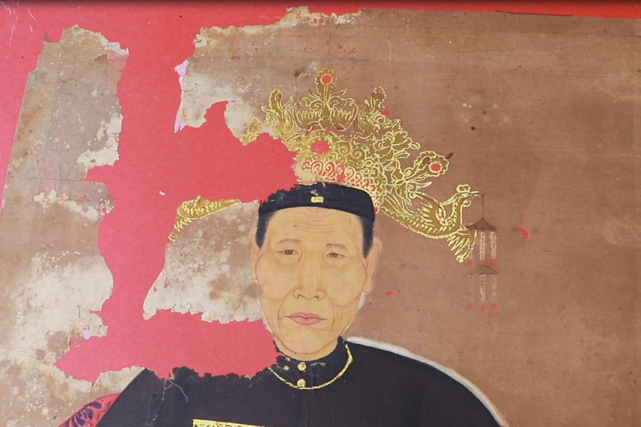 两件需要修复的画像为仙居县溪港乡塘弄村王氏家族所藏清代画像,因年代久远加保存不当,画像出现了霉烂、糟朽、絮化、脆化、掉色、断裂、虫蚀等病害,已不适合长期保存与展示,故需进行紧急修复。画幅装裱形式为传统手工纸镶绫边,均伴有大面积糟朽及缺失,两幅画像天头画赞处均大面积缺失,仅存右边一半,画幅有多处折痕及贯穿伤,因保存不当受潮后大面积滋生霉菌,颜料极易剥落,在前期的保存过程中背后有使用过大面积化工胶水及多层A4纸叠粘,整个修复过程难度较大。