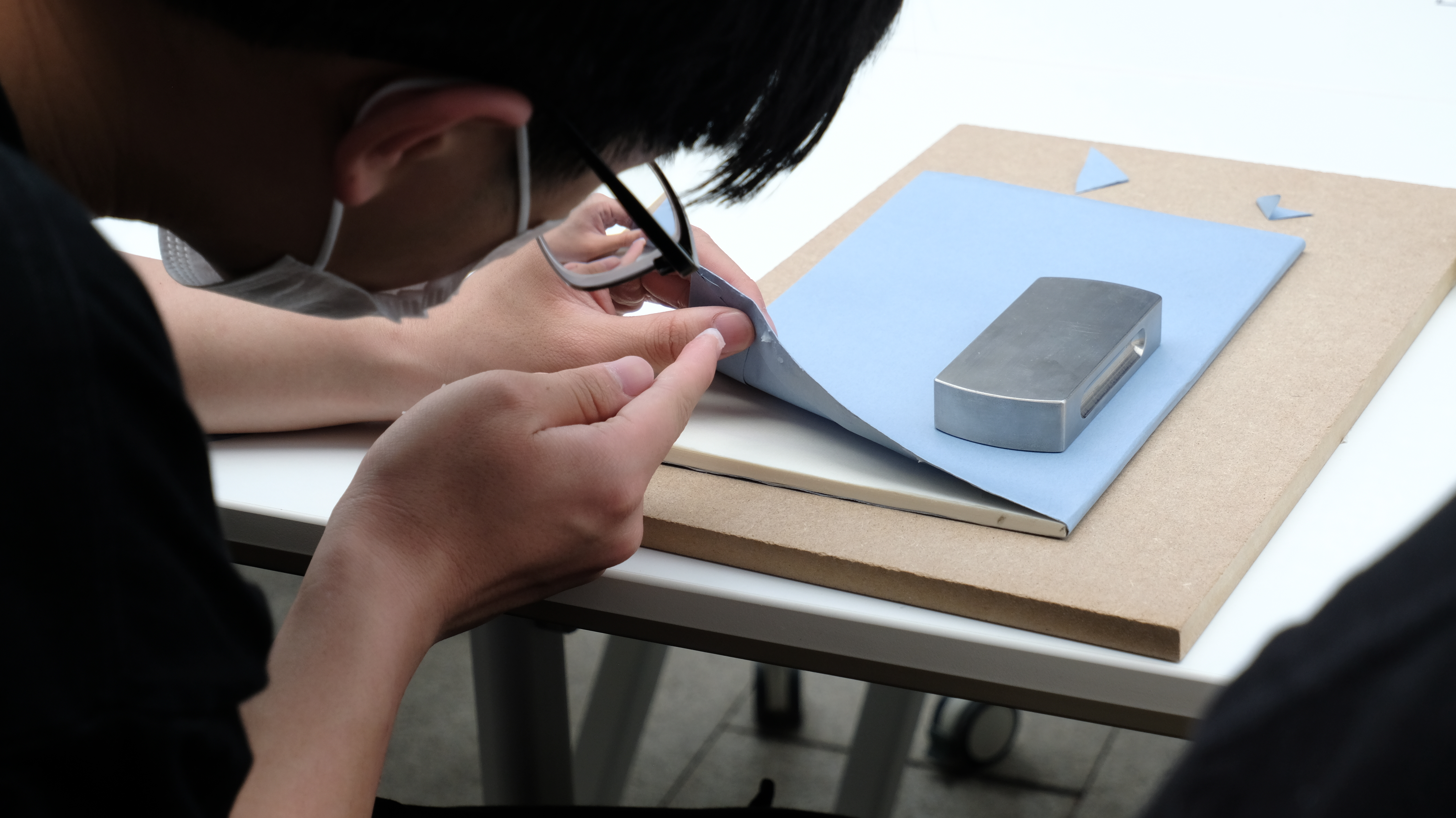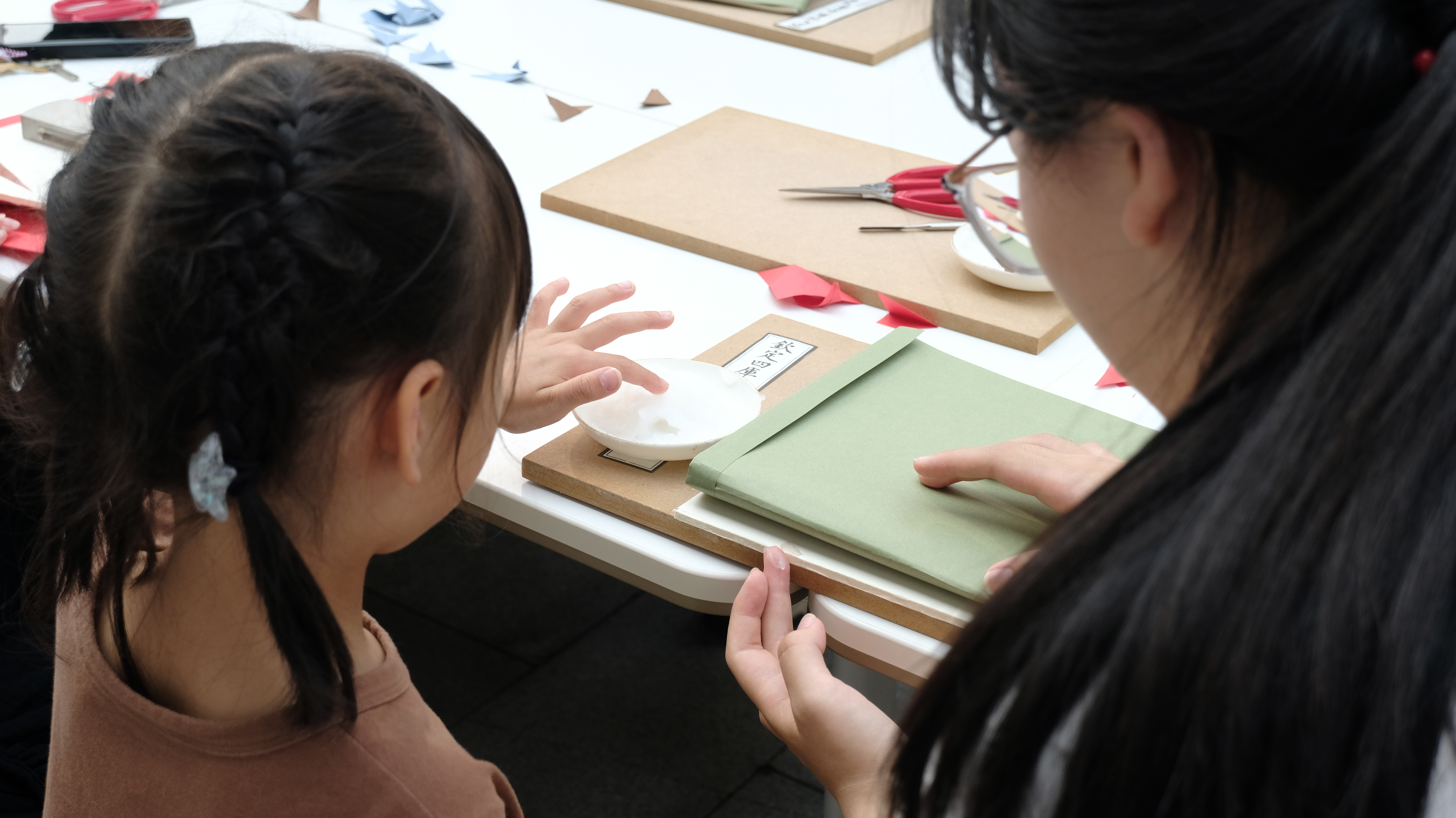 在活动中,手工艺学子详细讲解包背装帧的制作流程。从裁剪纸张、折叠书页,到浆糊粘贴、包裹书背,体验者亲手制作出一本属于自己的包背装书籍,深切体验古籍装帧的魅力。
