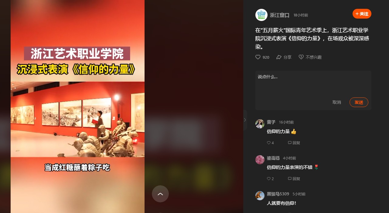 在“五月薪火”国际青年艺术季上,浙江艺术职业学院沉浸式表演《信仰的力量》,在场观众被深深感染。