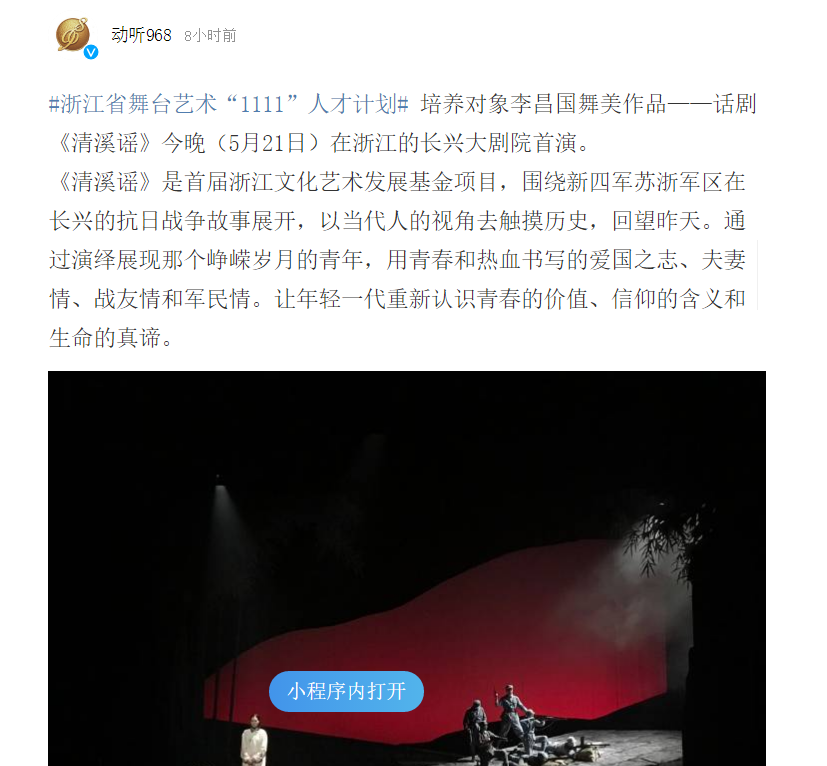 动听968微博:#浙江省舞台艺术“1111”人才计划# 培养对象李昌国舞美作品——话剧《清溪谣》今晚(5月21日)在浙江的长兴大剧院首演。