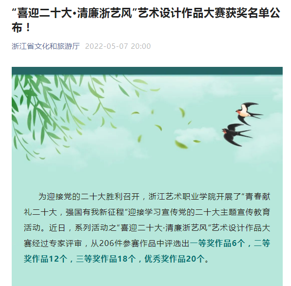 浙江省文化和旅游厅:“喜迎二十大·清廉浙艺风”艺术设计作品大赛获奖名单公布!