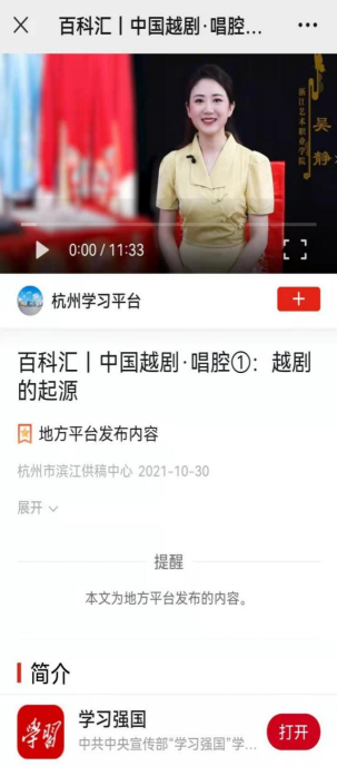 越剧已走过百余个春秋,而当网络直播、短视频等方式汹涌袭来,如何创新发展,站稳时代脚跟?浙江艺术职业学院选择这样做。日前,在教育部办公厅关于公布2022年职业教育国家在线精品课程名单的公告中,浙江艺术职业学院《中国越剧•唱腔》被评定为2022年职业教育国家级在线精品课程,广大戏迷可以在线学到标准的越剧唱腔了。