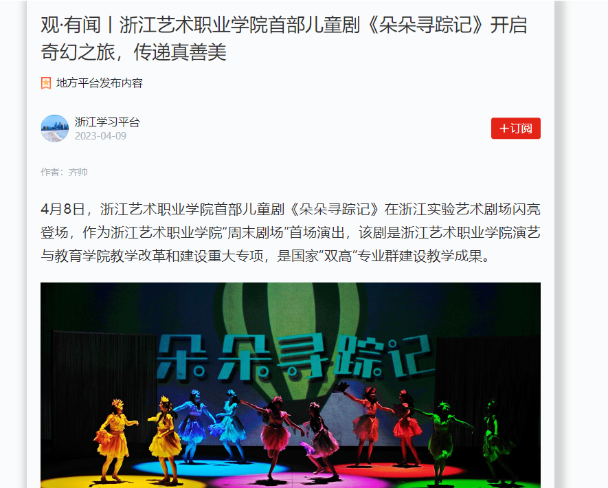 4月8日,浙江艺术职业学院首部儿童剧《朵朵寻踪记》在浙江实验艺术剧场闪亮登场,作为浙江艺术职业学院“周末剧场”首场演出,该剧是浙江艺术职业学院演艺与教育学院教学改革和建设重大专项,是国家“双高”专业群建设教学成果。