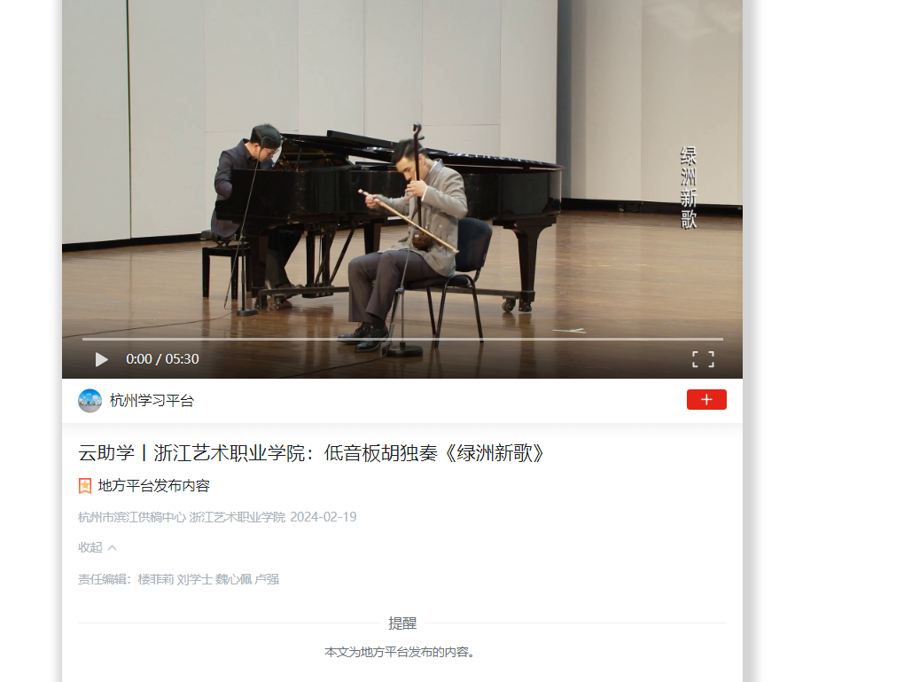 学习强国杭州平台:云助学丨浙江艺术职业学院:低音板胡独奏《绿洲新歌》