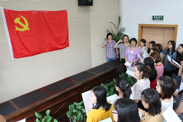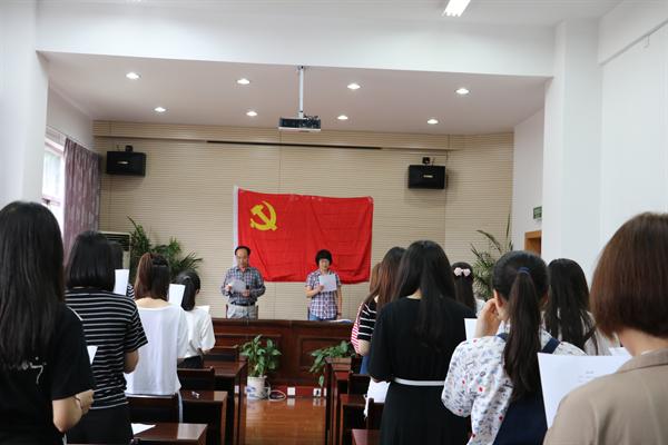 最后,系党总支组织委员胡海影带领师生党员面向党旗,举起右拳,进行庄严宣誓。
