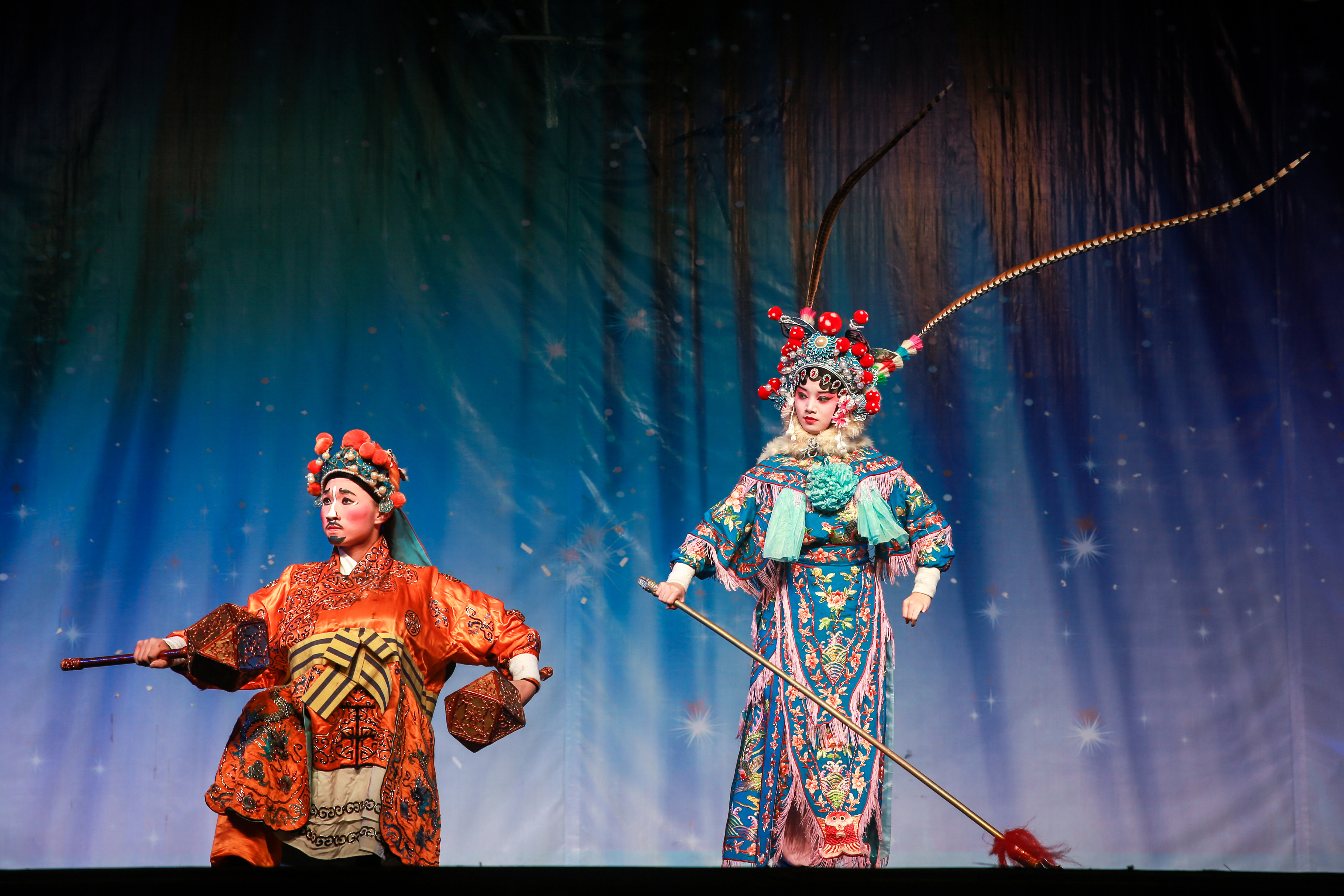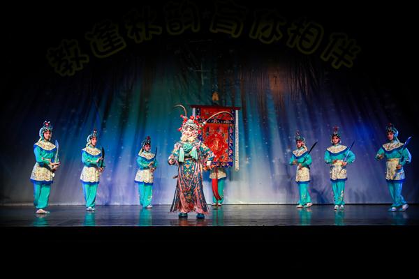 传统短打武生剧目《三岔口》拉开了演出的帷幕。故事讲述宋朝年间,焦赞因杀死谢金吾而被发配到沙门岛,途中住进刘利华店中。任堂惠奉命暗中保护焦赞,也住进此店。夜间,任刘双方发生误会,一场恶战在黑暗中展开,焦赞出面,方解此围。剧情中因为身处黑夜,饰演任刘二人的演员用形象的表演将摸黑搏斗的情态表现了出来,引发了同学们的阵阵笑声。