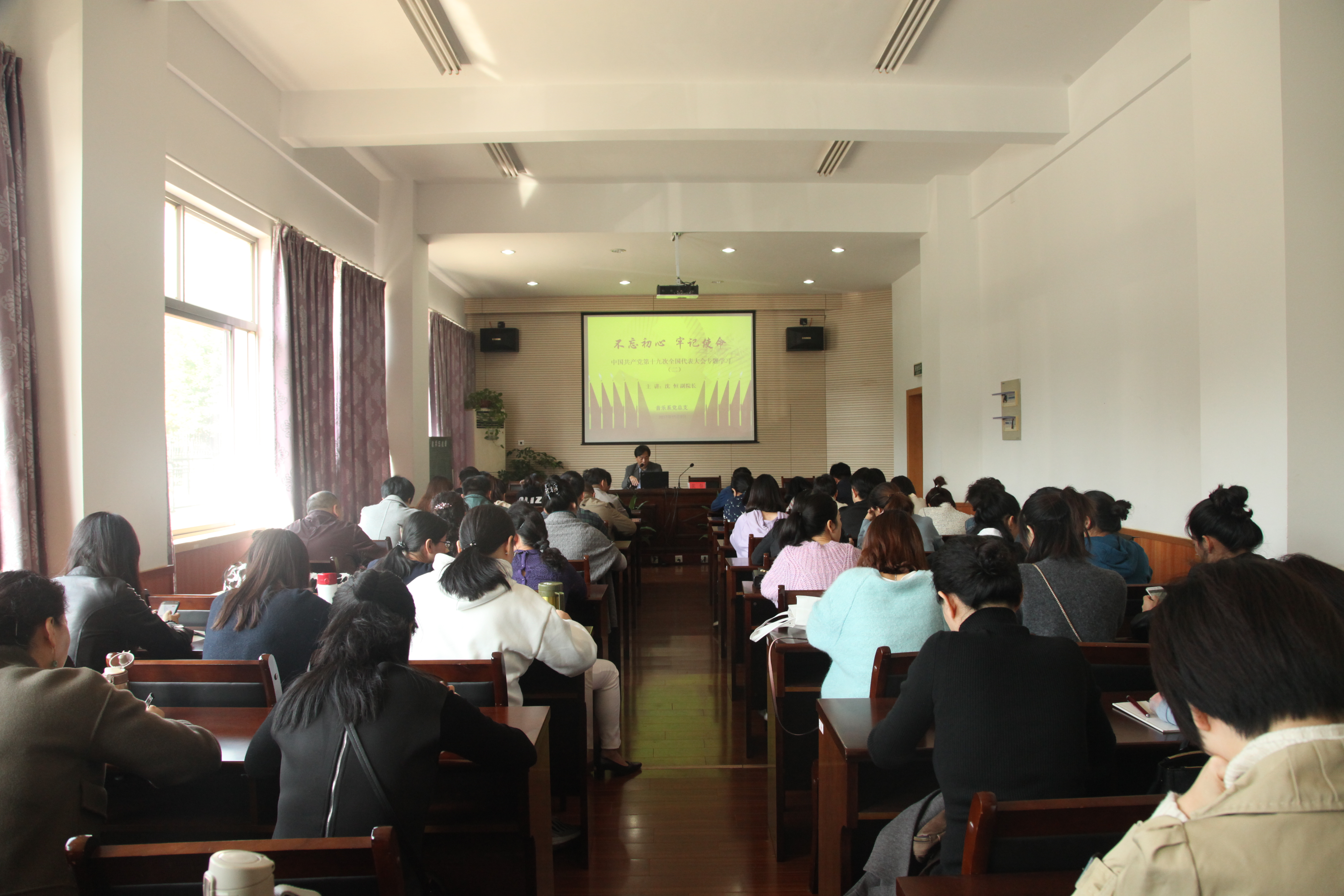 11月9日中午,音乐系党总支在13104报告厅举行“不忘初心 牢记使命”中国共产党第十九次全国代表大会精神专题学习会。院党委委员、副院长沈恒为在座党员师生宣讲党的十九大精神。