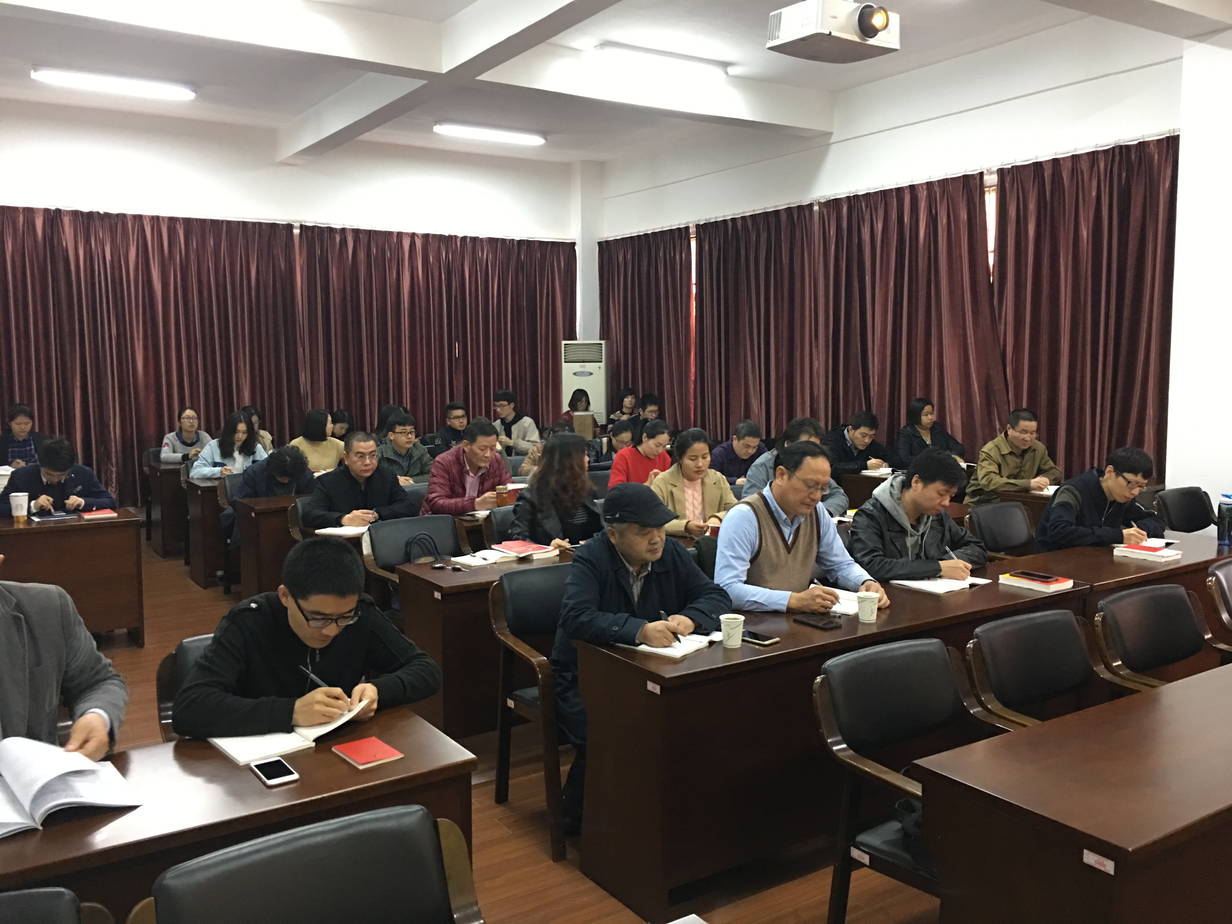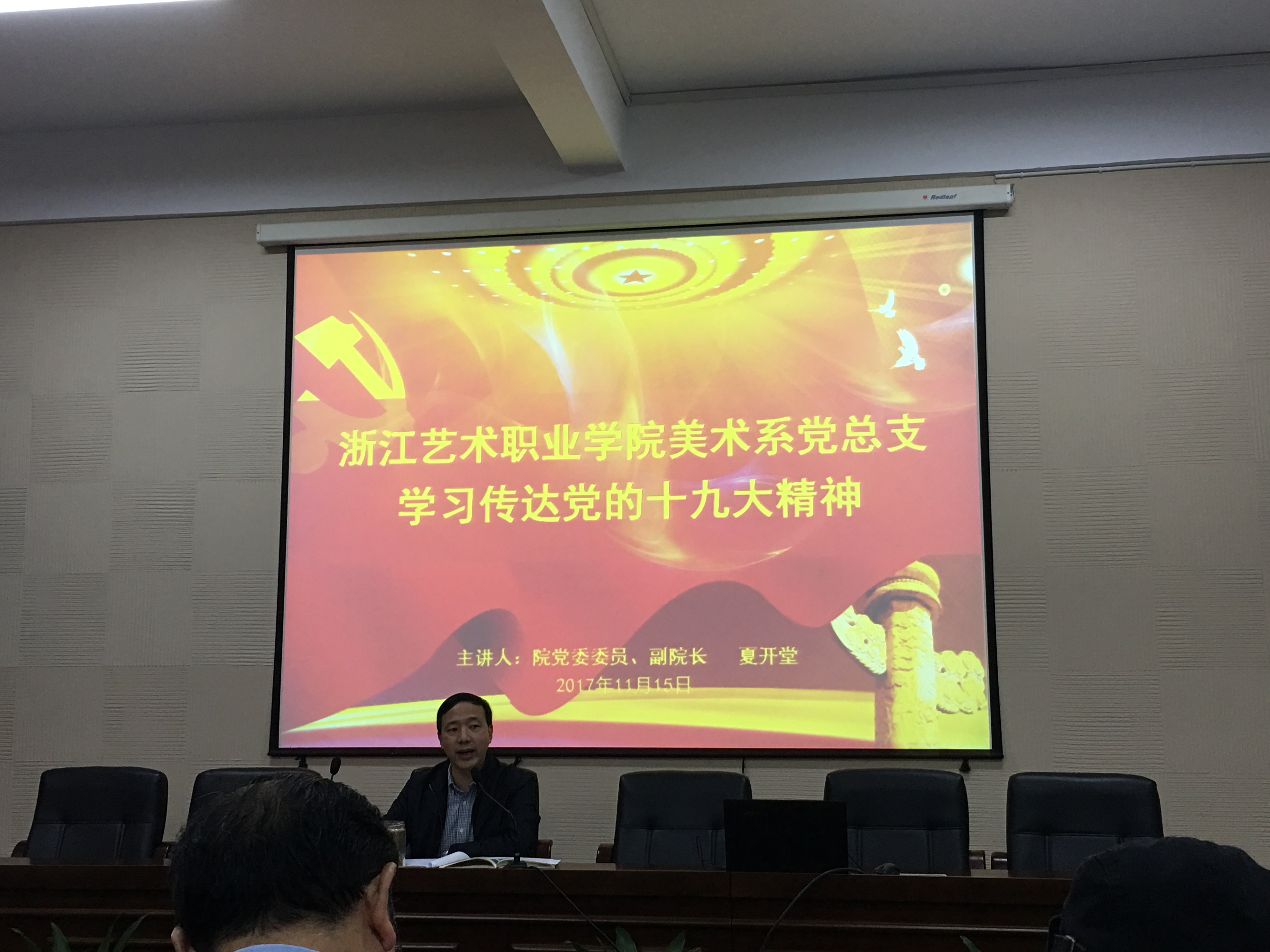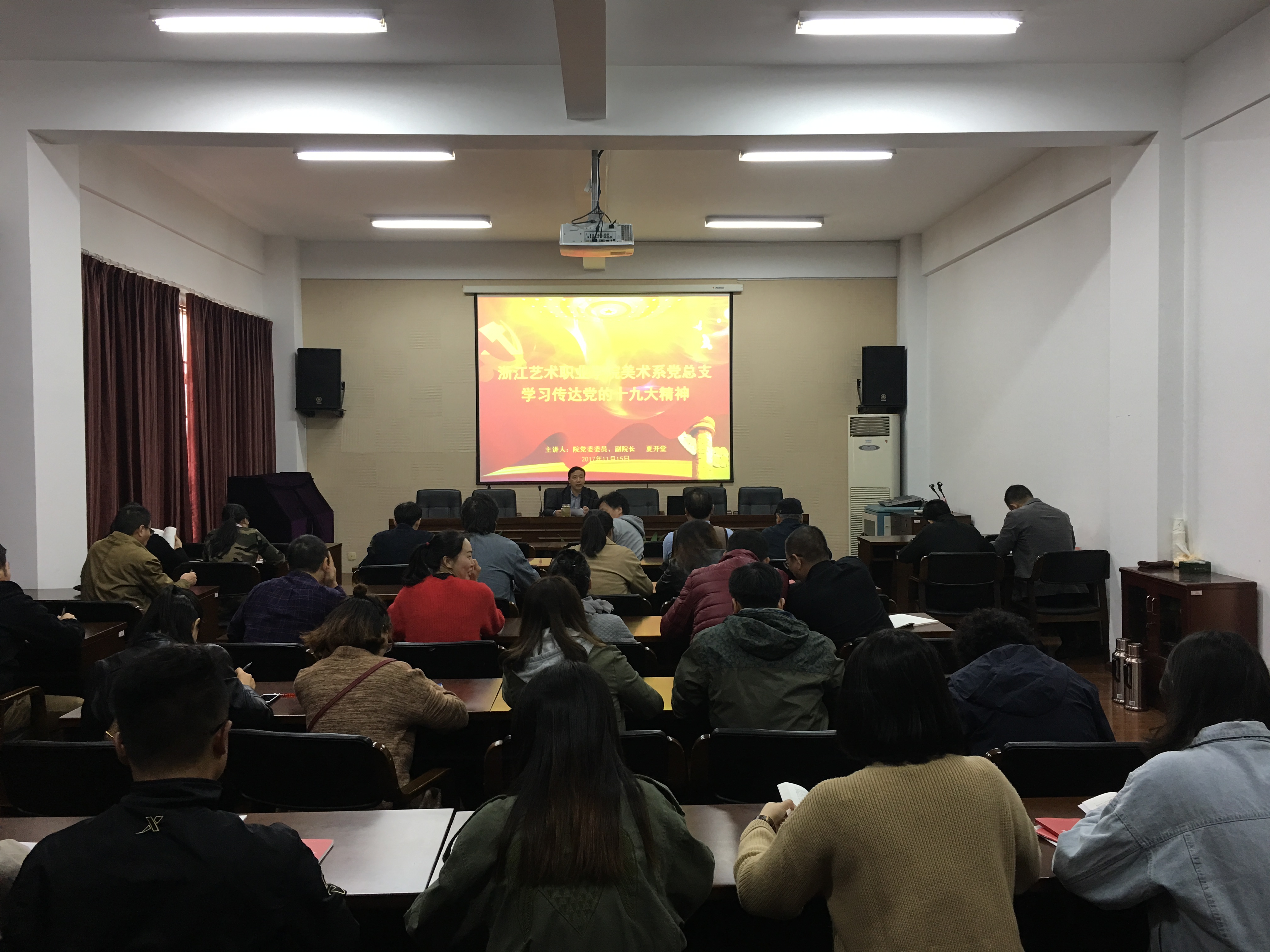 11月15日中午,美术系党总支与宣传部党支部、学工部党支部、财务处党支部全体党员齐聚13号楼一楼会议室,共同聆听院党委委员、副院长夏开堂所作的党的十九大精神学习会。