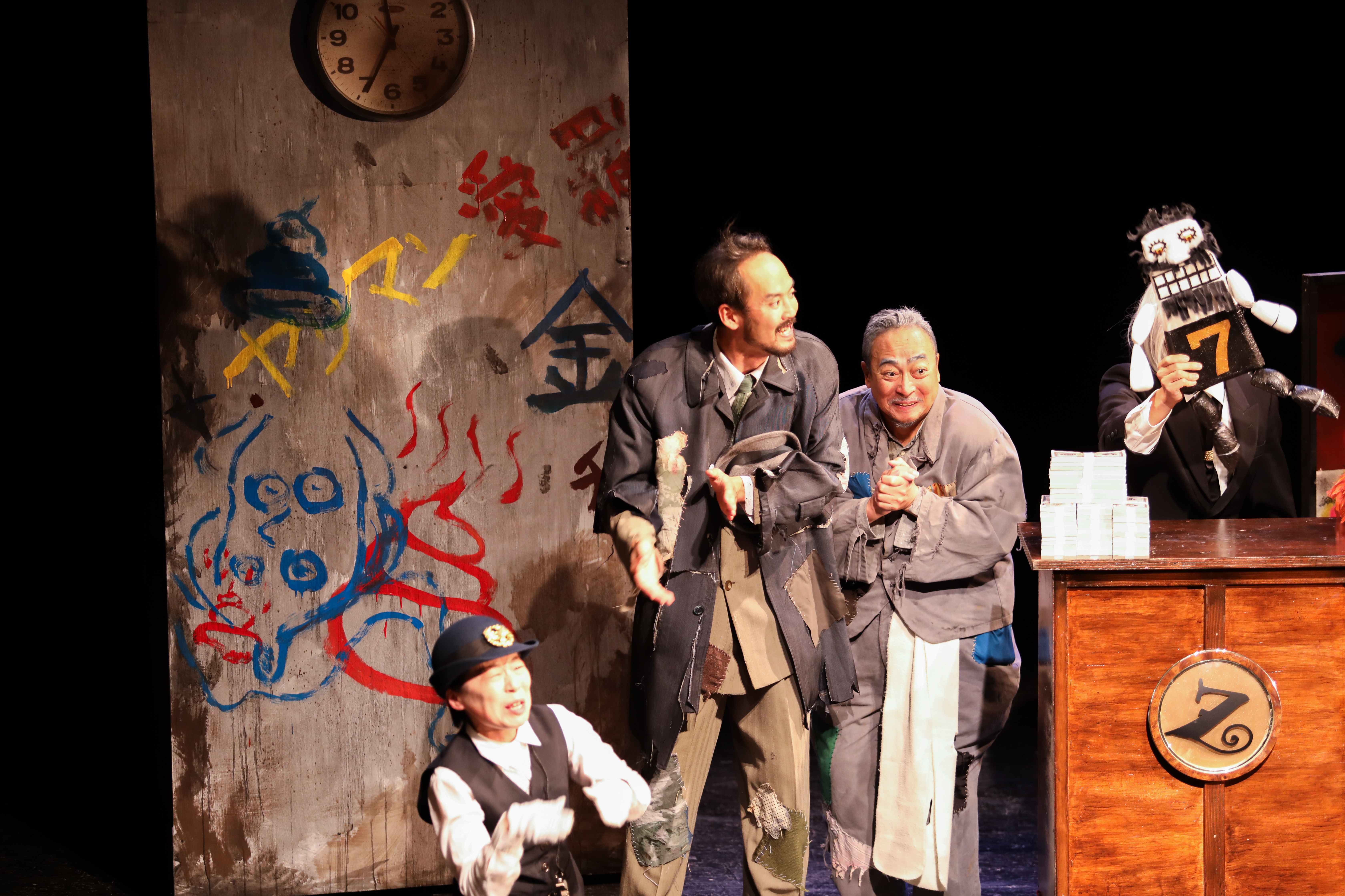 这是一部具有怪诞风格的现实主义剧作。作为一种风格形态,全剧运用了夸张的手法,将居仑城衰败的极致和克莱尔超人的财力夸张化,构建成一个怪诞的情境,在给观众带来欢乐的同时让大家明白道德反省的必要和人道主义终究不可被战胜的现实,展现出一场现代化的社会改革实验。中岛谅人先生在导演这部剧的时候采用了许多的剧场效果,他将现场的观众与演员连接起来,把观众变为“同谋”,使人身临其境,这产生的效果不仅是对剧中人的批判,其实也是催逼每一个人对自己生活当中的这种社会行为做出判断和反思。现场的观众也被他们淋漓尽致的表演所深深吸引,触发了自己心底的感受。