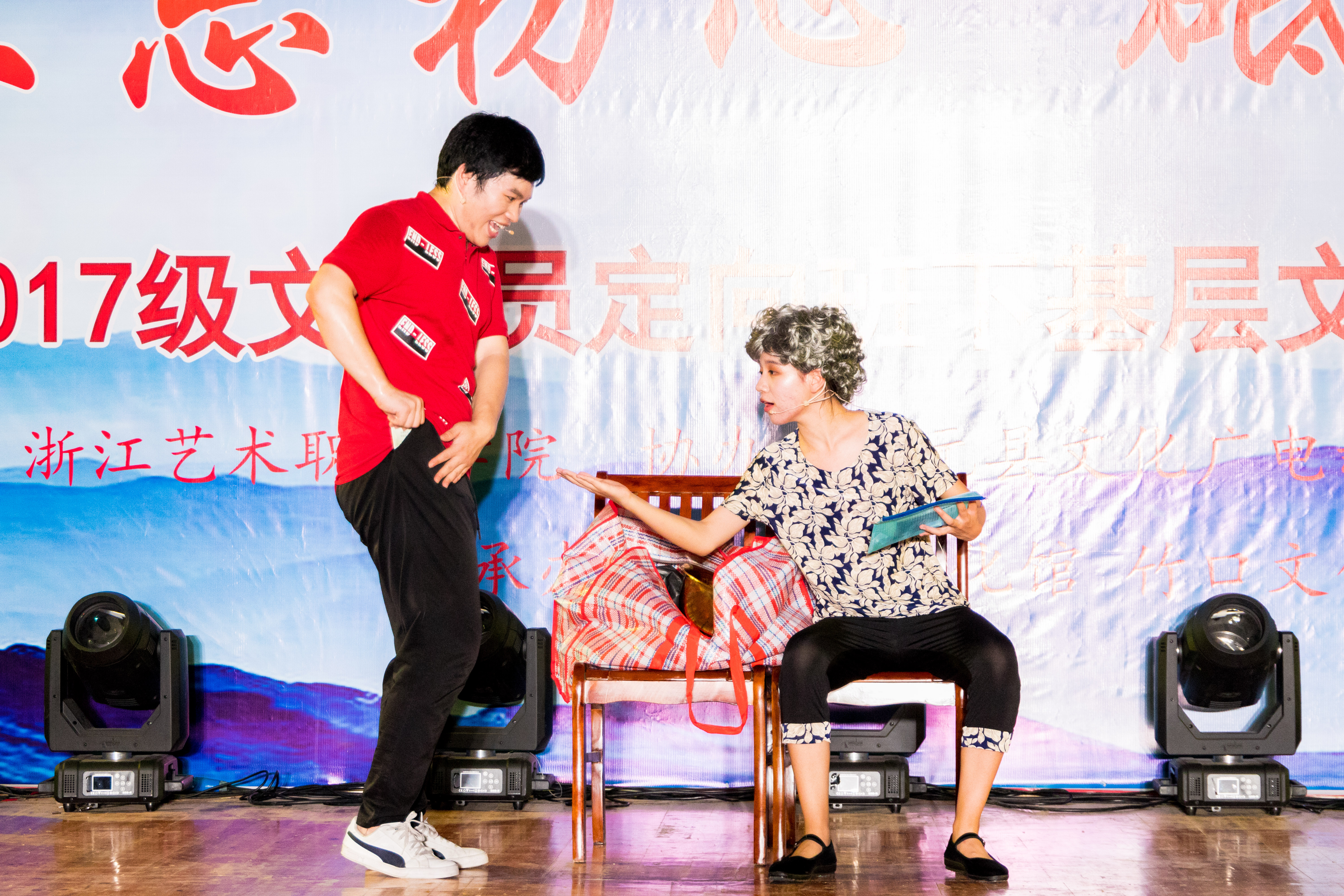 本次走进文化礼堂汇报演出活动,不仅是对2017级乡镇文化员定向班全体同学在浙艺学习一年的阶段性成果检验,通过深入各地文化礼堂演出,更是为他们熟悉、了解将来的工作环境、工作内容提供了机会,因此学生们都非常重视,全身心投入到此次演出的筹备、实施过程中。为保障演出的顺利进行,同学们自主协商分成道具组、化妆组、宣传组、后勤保障组等,全面承担起整台演出的各项工作,充分体现了“一专多能”的复合型人才要求。与表演系学生到文化礼堂演出所不同的是,乡镇文化员定向班得汇报演出不只是为当地百姓送去文艺节目,更是要走进不同乡镇的文化礼堂,考察当地博物馆与文化馆,实地深入了解当地的民俗民风和历史文化,便于将来工作之后能胜任基层文化员岗位,真正做到将文化送入千家万户。