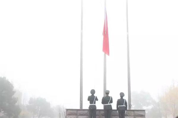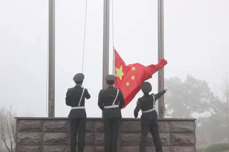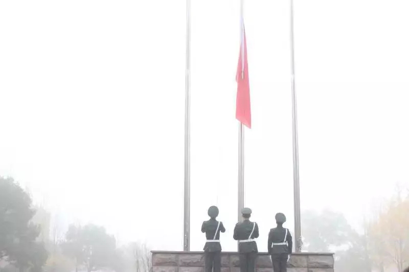 浓雾遮不住国旗的火红鲜艳。同学们目视着五星红旗冉冉升起,伴着慷慨的《义勇军进行曲》,心中充满了力量。
