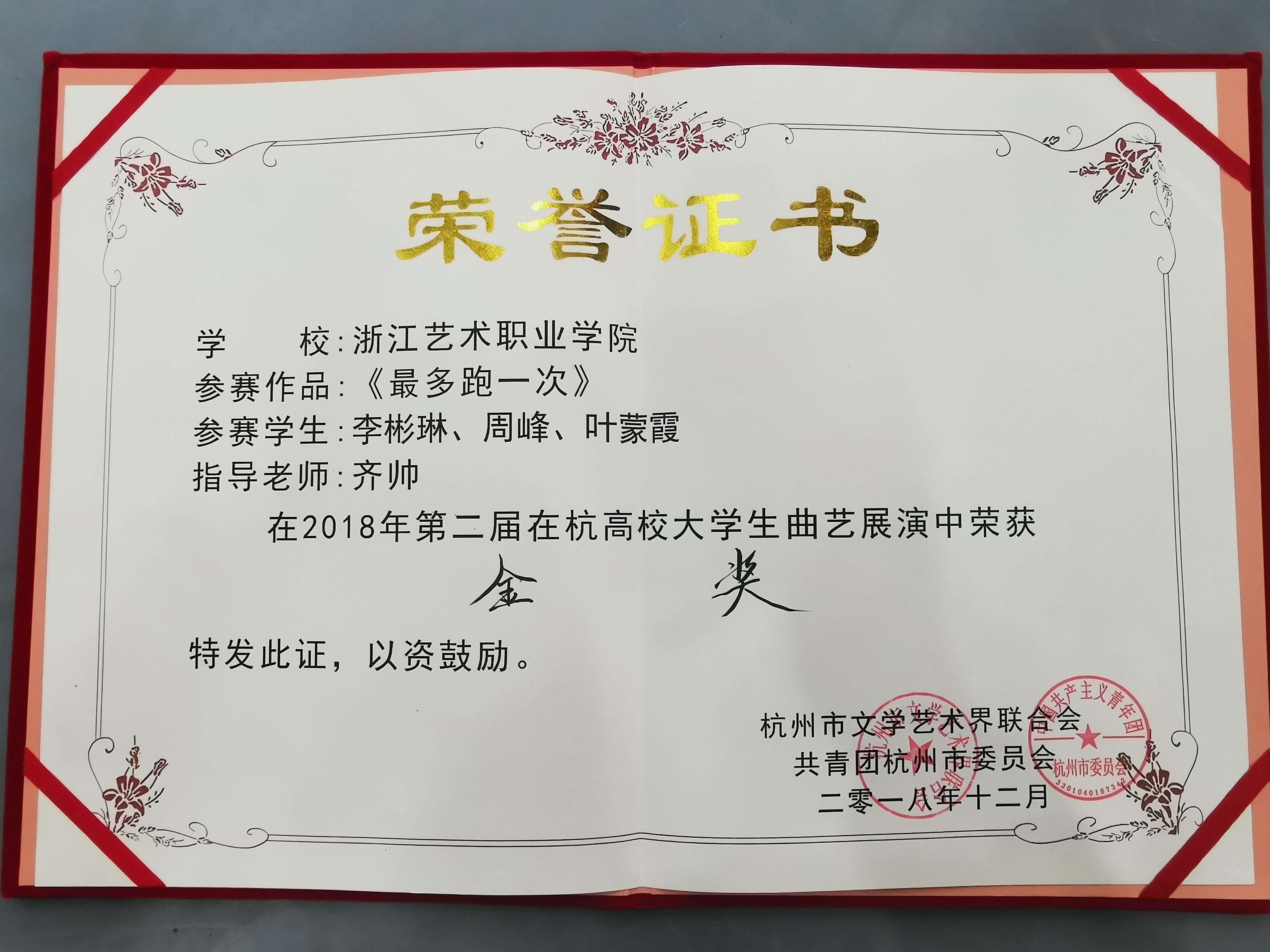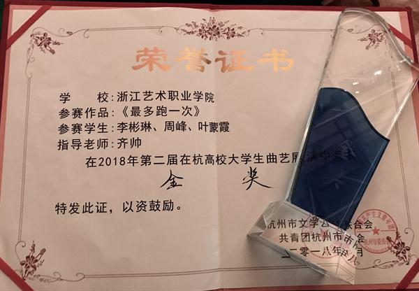12月2日晚,“庆祝改革开放40周年”第二届在杭高校大学生曲艺展演颁奖典礼在浙江水利水电学院举行。浙江艺术职业学院文化管理系17级文化员定向班李彬琳、周峰、叶蒙霞演绎的《最多跑一次》和陈雨禾、张奔等出演的《传承》两个原创小品分别荣获金奖、铜奖。