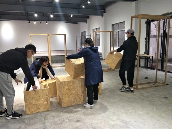 为提高展厅与效果图的接近度,同学们在现场做了二次数据记录。经过一天整理,大家对礼堂整体布局进一步了解,在制作材料到达现场后,大家立即分组进行布置陈列,根据实地环境,在老师指导下不断进行调整与修改。