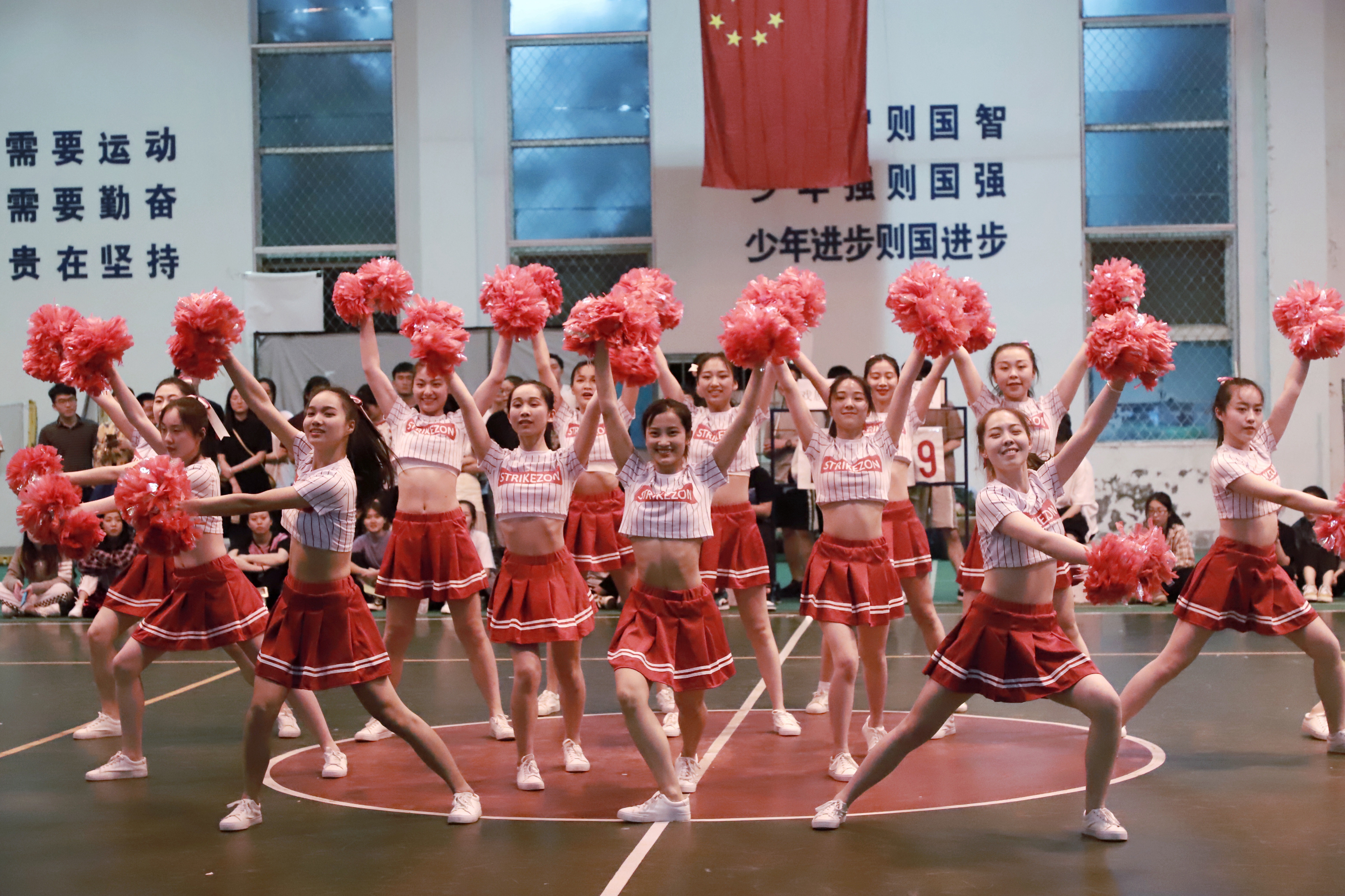答:这个曲目是我们舞蹈老师选的,因为考虑到要调动现场气氛,我们就挑选了节奏比较明快的,比较嗨的曲目进行搭配啦啦操。(比赛分规定套路和自选套路,规定套路音乐由组委会提供,自选套路由各系自行决定)