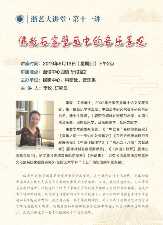 6月13日下午,敦煌音乐研究专家、中国艺术研究院音乐研究所研究员、博士生导师李玫做客浙艺讲坛,在图信中心为师生们带来了一场题为《佛教石窟壁画中的音乐景观》的精彩讲座。讲座由民间文艺研究中心副主任(主持工作)史长虹主持。
