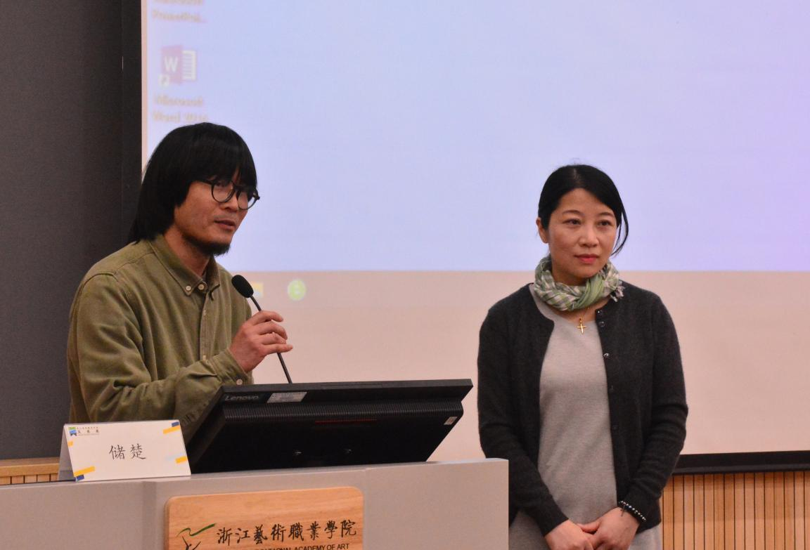 美术系常务副主任李昌国主持讲座并为储楚颁发荣誉证书。