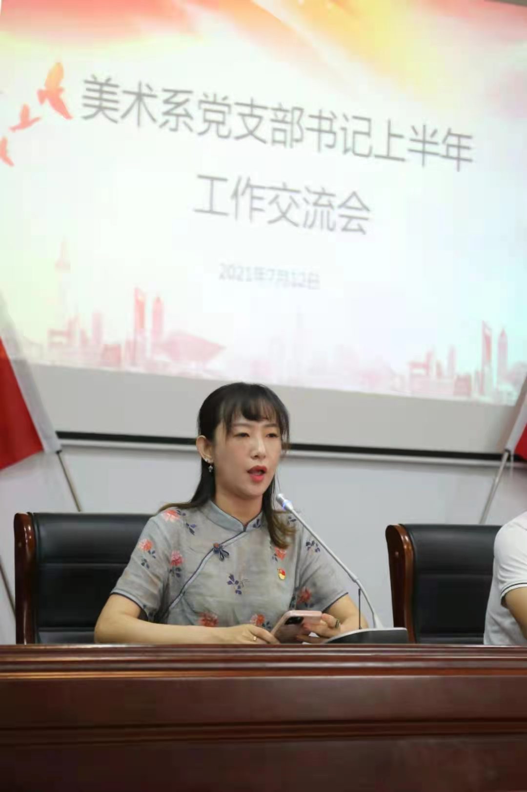 在纪念馆会议室内,美术系党总支还开展了上半年党史学习教育工作交流会,会议由美术系党总支副书记顾才铭主持。美术系党总支书记汪琳就上半年党史学习教育情况进行了总结并作了下半年工作部署。