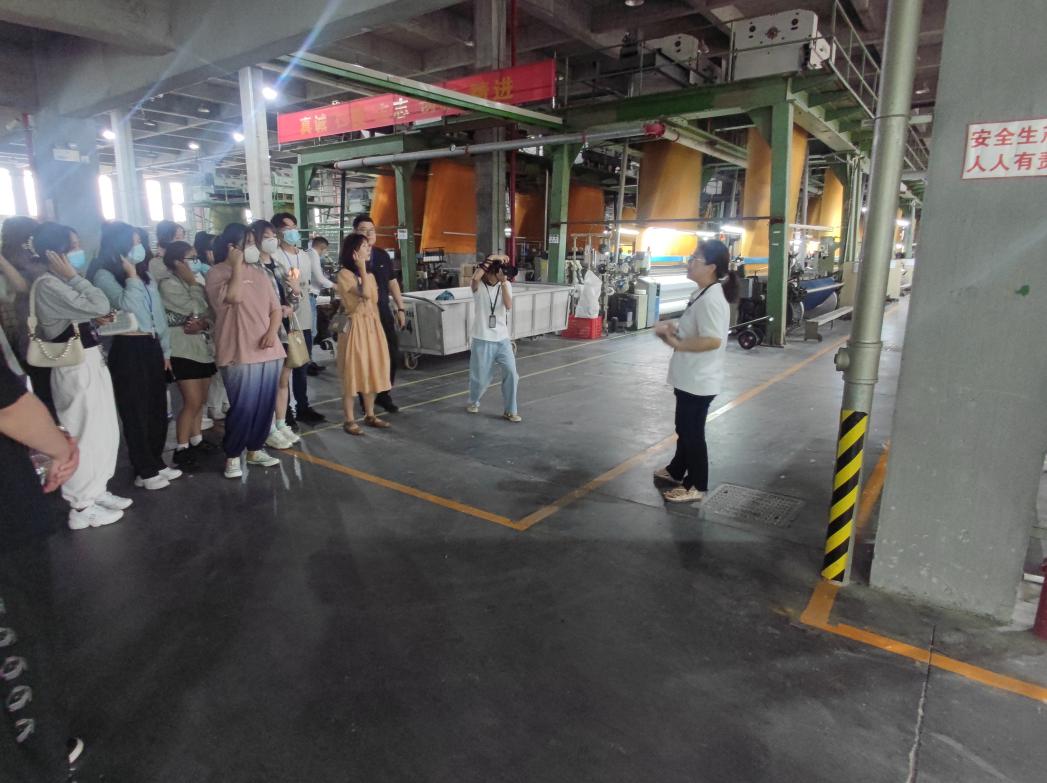 企业生产经理为同学们讲解织造、绣花、印染、涂层等工艺流程。听着巨大的机器发出震耳的声音,看着忙碌的工人穿梭在工厂内。同学们第一次近距离地参观窗帘的制作,同时了解到窗帘的制作工艺。