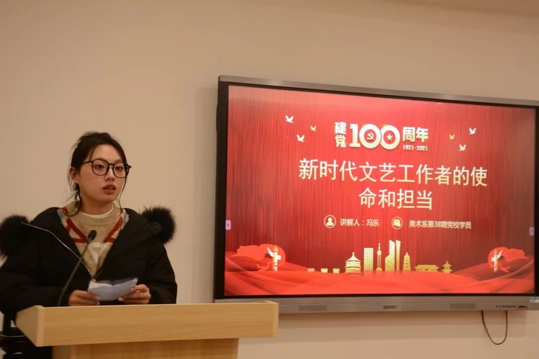 12月17日,美术系学生党支部开展“奋进新征程担当新使命 争做新时代文艺工作者”第二届主题微党课比赛。此前,来自第38期党校学员的10名同学,经过系部初赛选拔后,共有5名同学脱颖而出参加本次微党课决赛。美术系组织员章彪、学生党支部书记龚林峰、团总支副书记朱丹丹出席并担任比赛评委。全体学生党员、入党积极分子代表、青年理论学习小组成员代表等现场观摩学习。