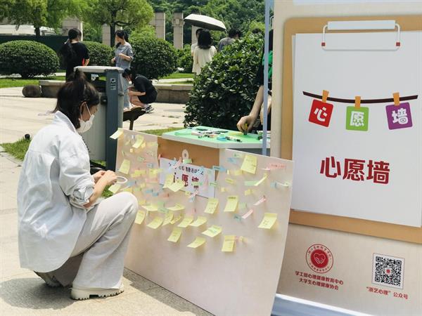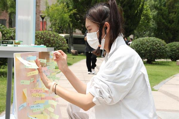 进行到最后环节时,同学们都聚集在心愿墙的游戏点。心愿墙上贴满了便签,志愿者还贴心地在两侧贴上了可作为提示的便签,供同学们联想。“今年暴富”“减重20斤”“希望能参加偶像的演唱会”这样发挥个人情感的便签随处可见;“专升本上岸”“明天考试顺利”“希望计算机考级能过”此类对学习的祝愿也屡见不鲜;更有少数民族的同学询问志愿者可不可以用藏语写下祝愿,眼里满是期许的她,答案当然是肯定的。