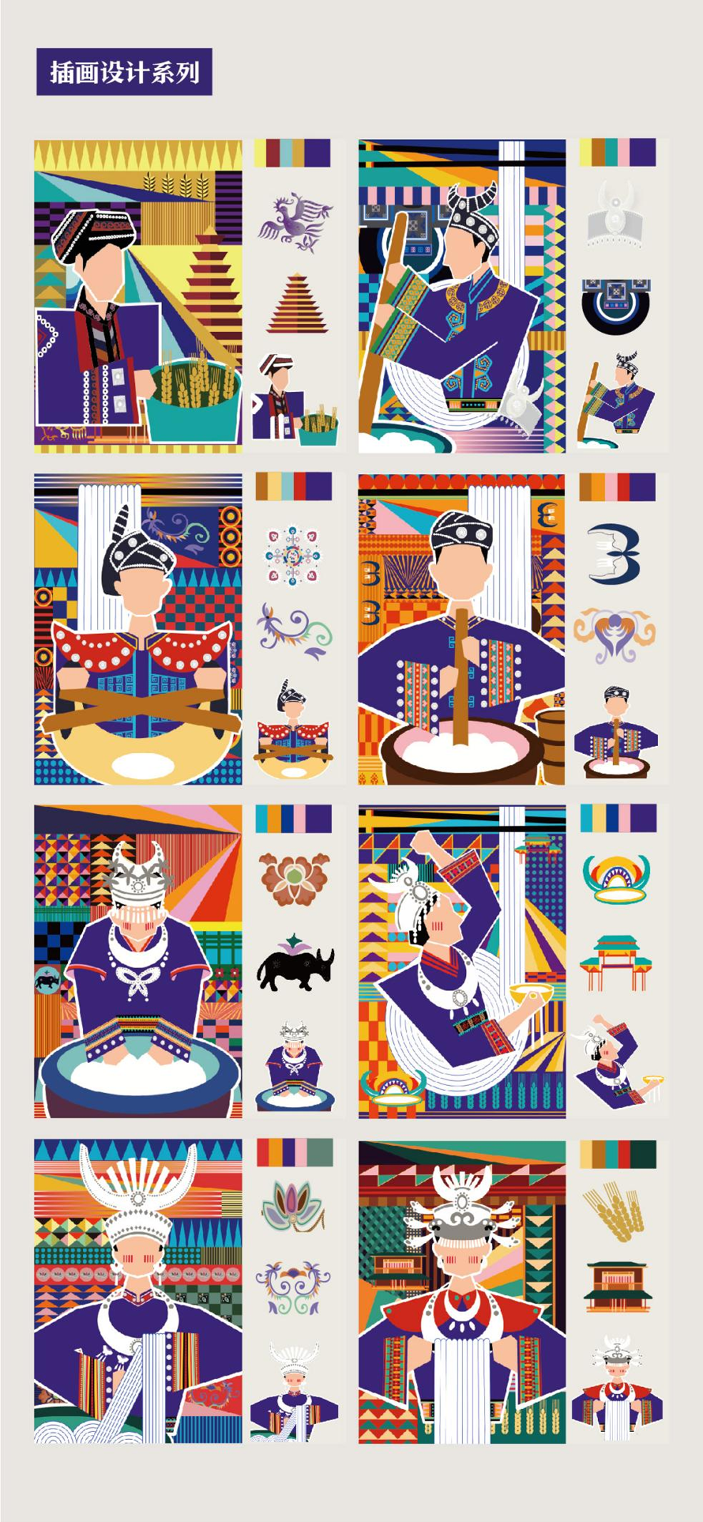 设计说明:课题对贵州当地特色米线--“粉乎”米线品牌进行整体形象系列打造和文创应用,以非遗文化传承与弘扬为主线,将贵州特色手工米粉浸渍、蒸煮、压榨等制作流程和工艺为主要元素,并结合当地建筑景点、服饰纹样、民俗文化、传统工艺等多方面背景,呈现多元性与多样性的贵州文化特征。通过抽象的现代几何风格,不同文化元素组合再造,协助贵州米线“粉乎”品牌,并进行一系列文创产品的开发与应用,助力贵州特色米线产品的市场拓展发展。