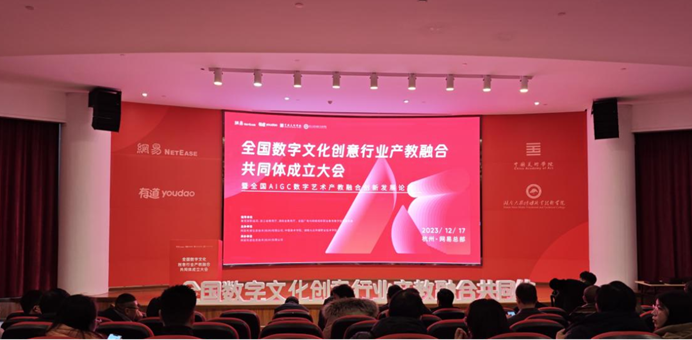 12月17日,全国数字文化创意行业产教融合共同体成立大会暨全国AIGC数字艺术产教融合创新发展论坛在杭州举行,来自各地的专家、学者汇聚一堂,共同探讨数字艺术产教融合创新发展之路。设计学院动漫设计专业带头人孙煜珑,专业教师吴炜栋参加了此次大会。会上宣布了浙江艺术职业学院当选为常务理事单位。