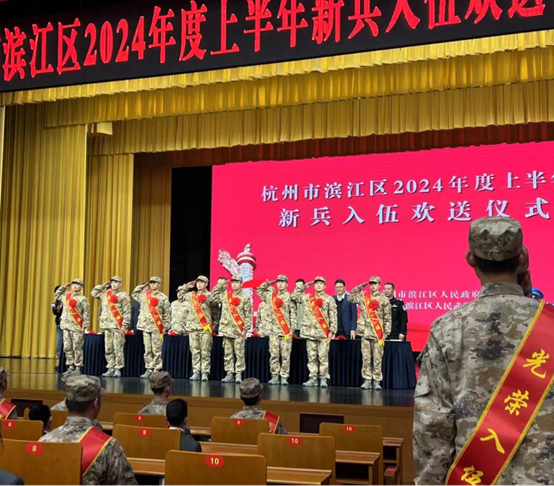 莘莘学子携笔从戎,参军报国建功立业。3月15日,杭州市滨江区2024年度上半年新兵入伍欢送仪式在区文化中心二层大礼堂举行。设计学院2021级服装与服饰设计班学生吴浩东经过体检、政考、审批定兵等环节选拔光荣入伍。设计学院党总支副书记汪仕龙,班主任王艺璇,保卫处干事茹叶辉参加仪式。