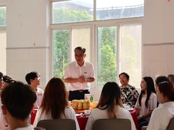 9月9日傍晚,新疆理工学院党委常委、副校长贺东辉,浙江艺术职业学院党委书记薛亮,校长施俊天,党委副书记夏开堂,副校长徐芳、刘秀峰,演教学院院长潘骅及班主任与27名新生们在食堂共进晚餐。
