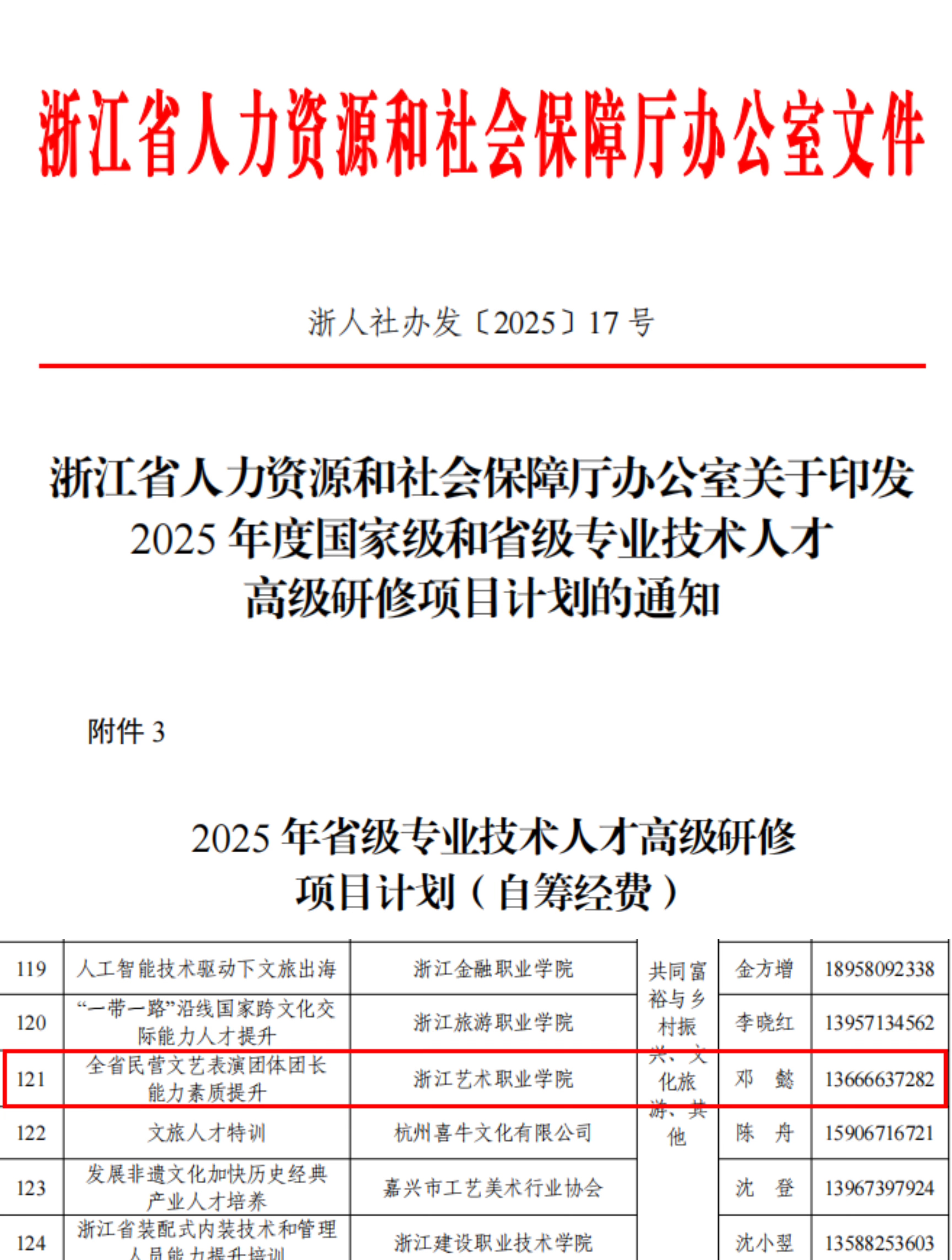 近日,浙江省人力资源和社会保障厅公布了2025年度国家级和省级专业技术人才高级研修项目评审结果,我校申报的《全省民营文艺表演团体团长能力素质提升》项目成功获批。